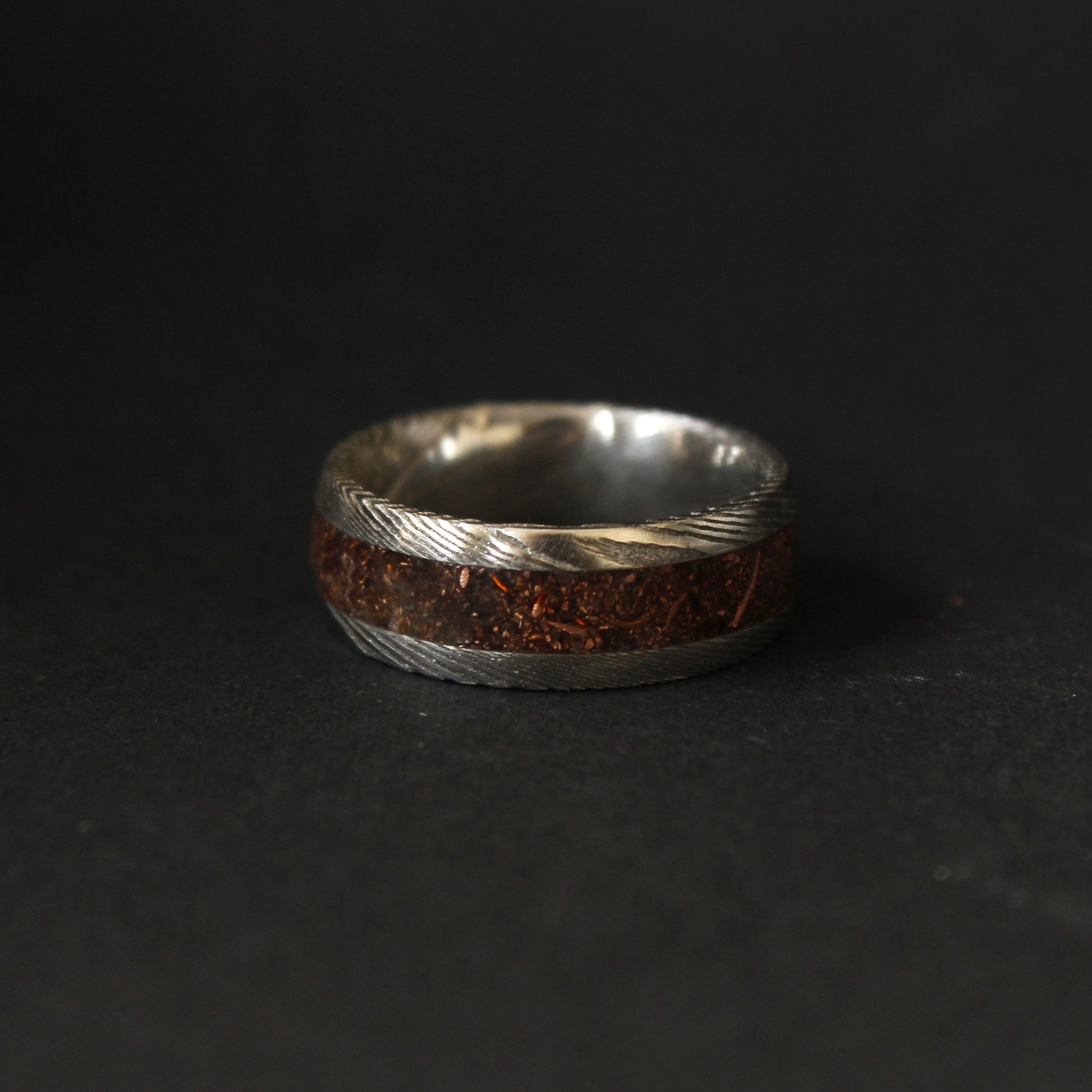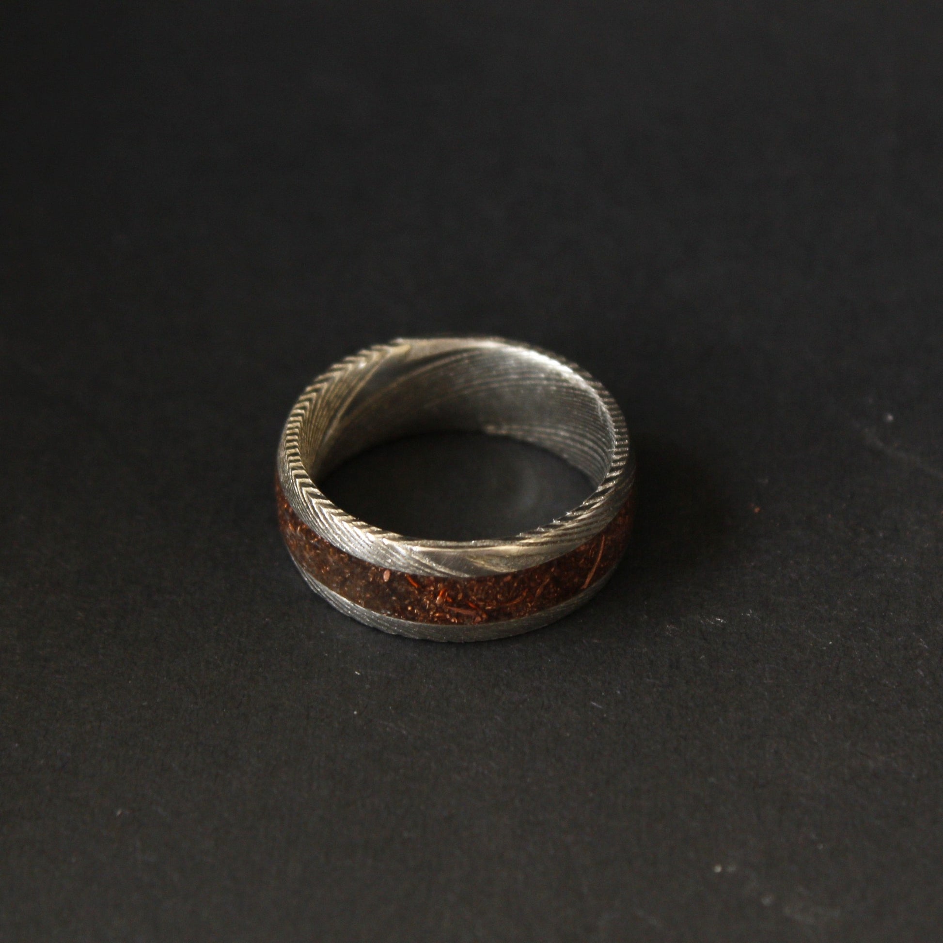 This listing is for a handmade stainless Damascus steel ring inlaid with copper flakes.