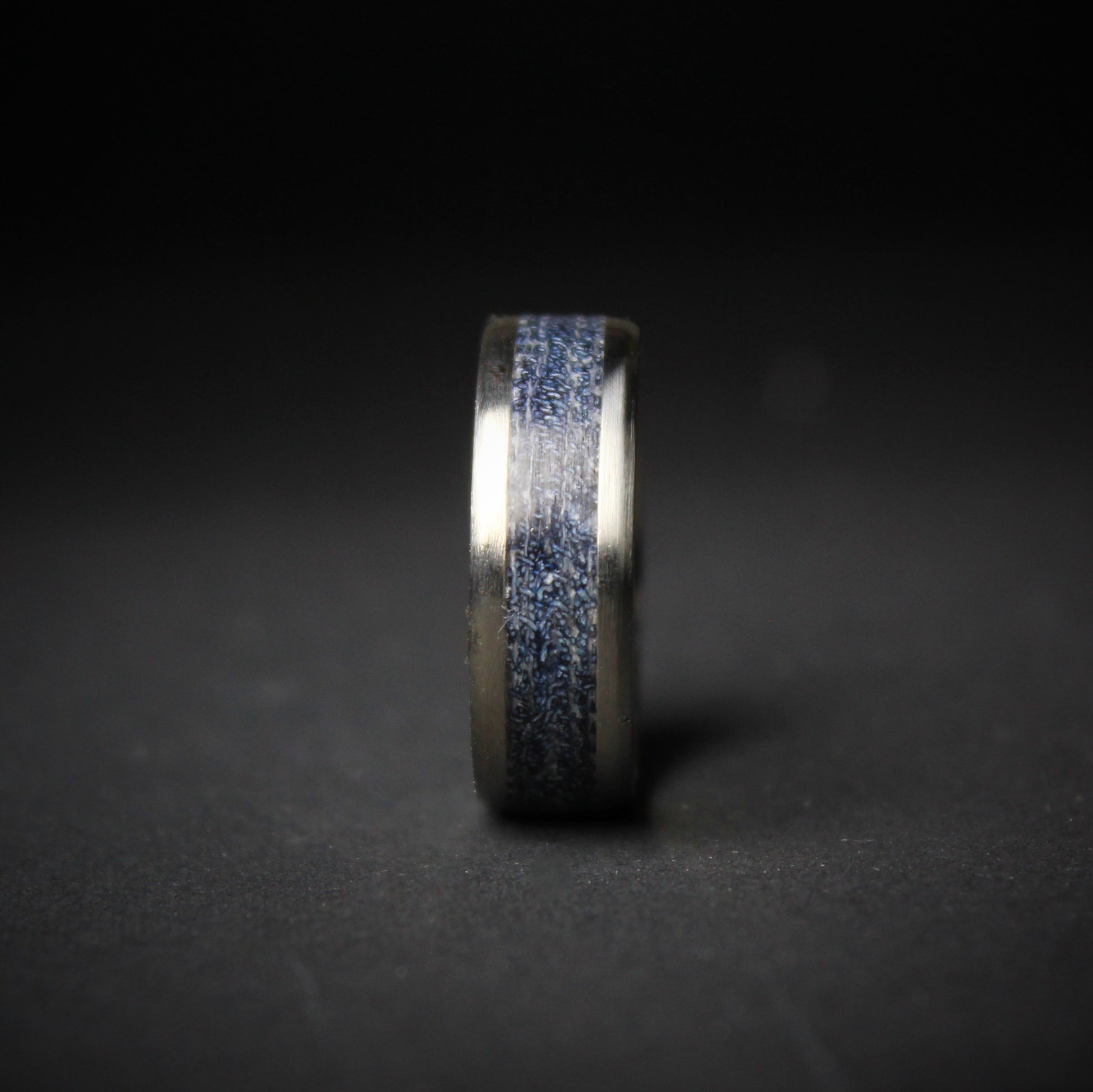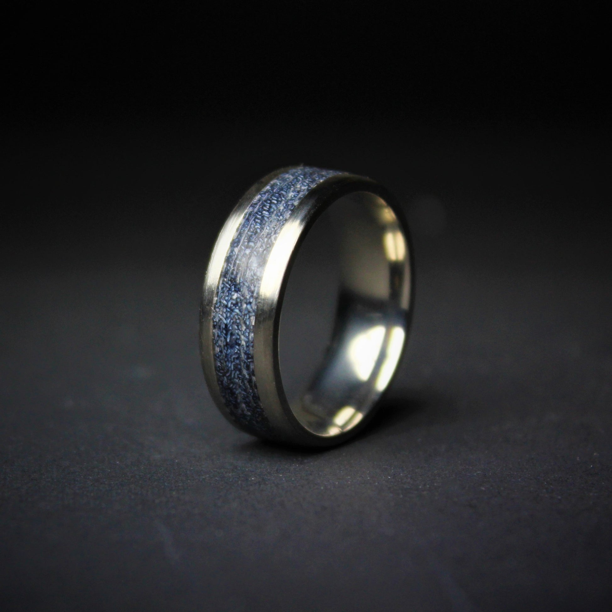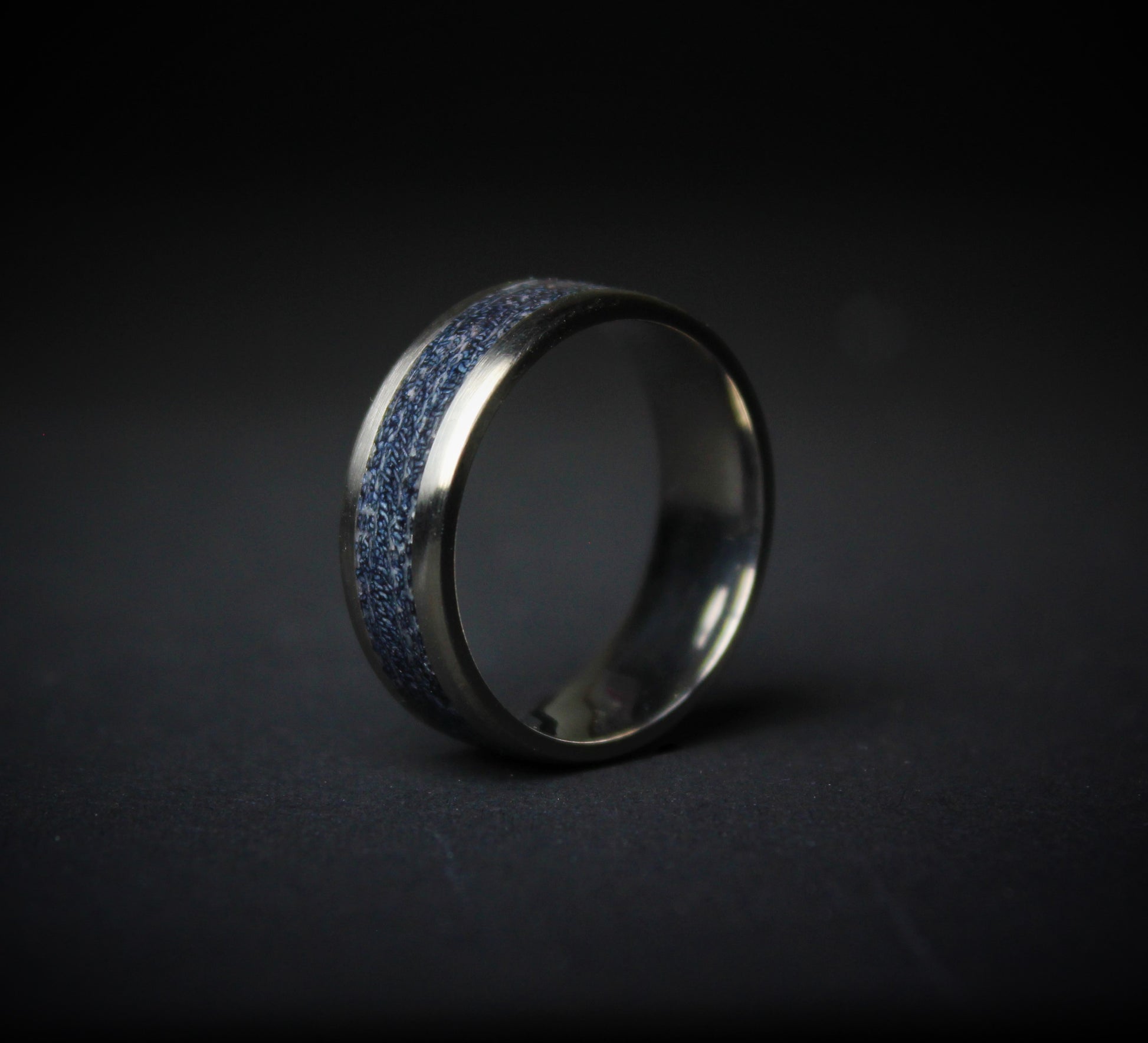 This listing is for the unique glow ring made out of titanium ring inlaid recycled denim fabric from real jeans pants.