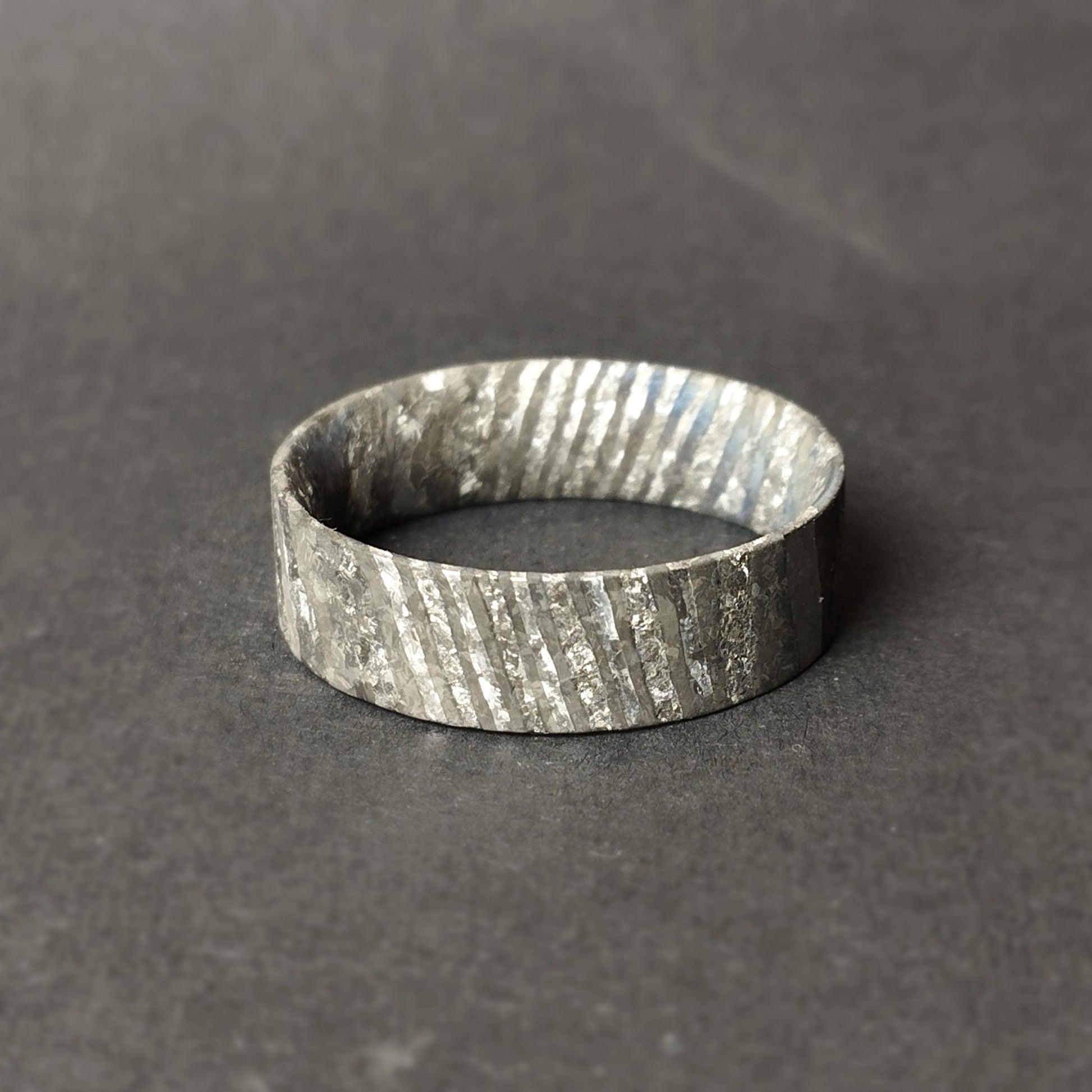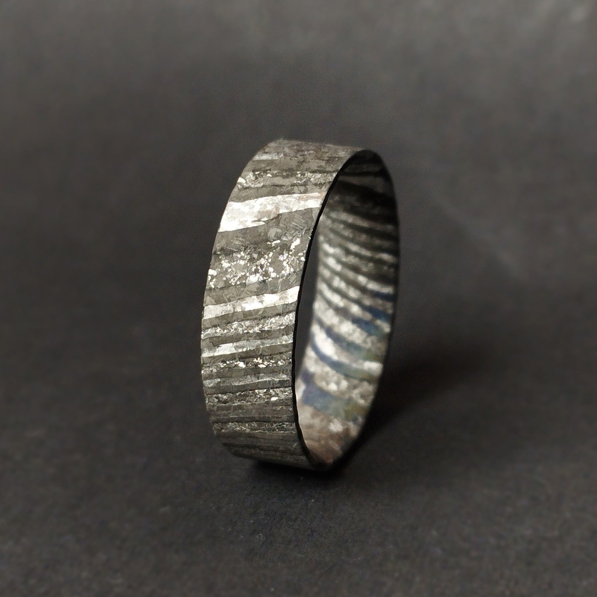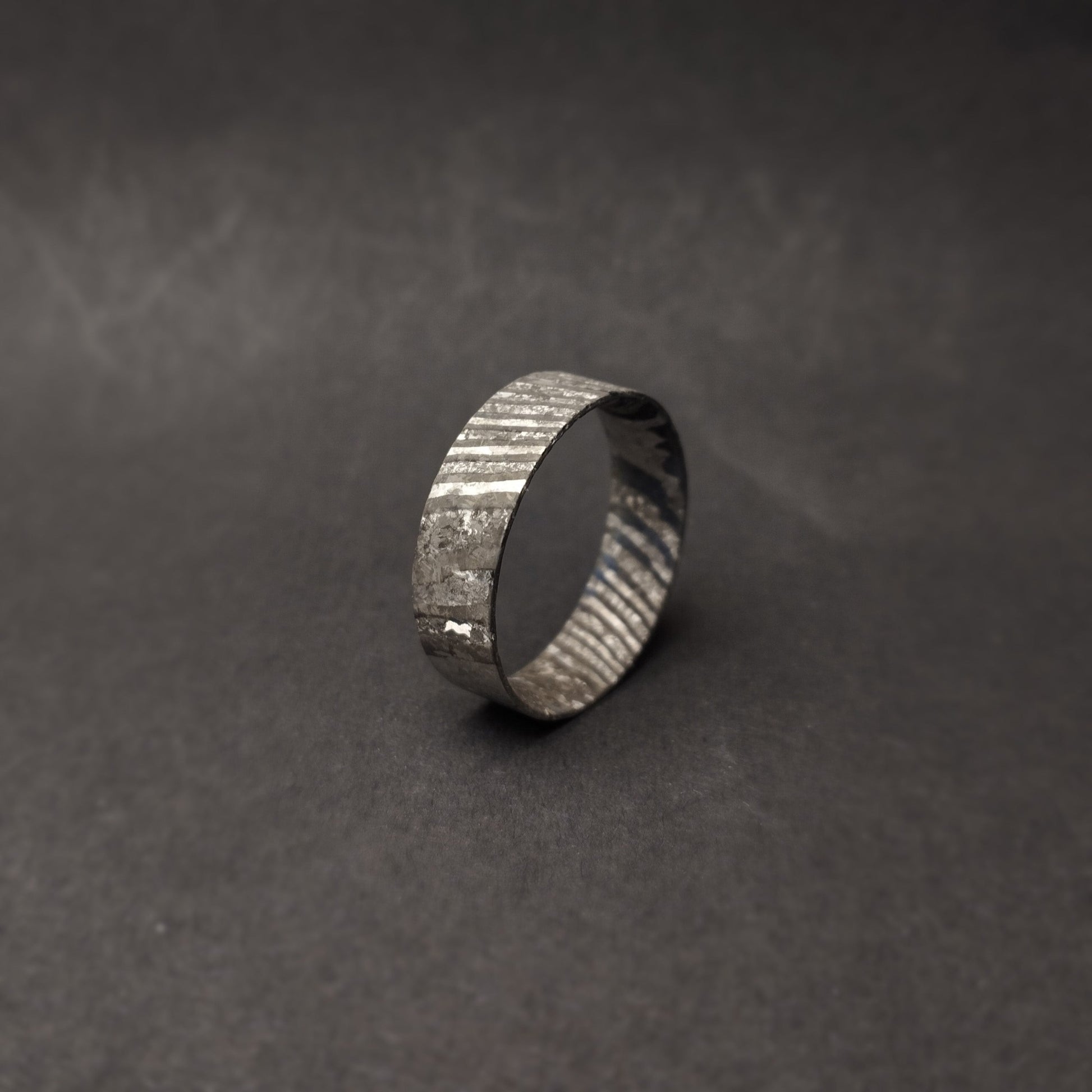 Timascus is a material created by folding 2 or more titanium alloys together, after the ring is ready it's etched in acid to reveal the unique pattern.
