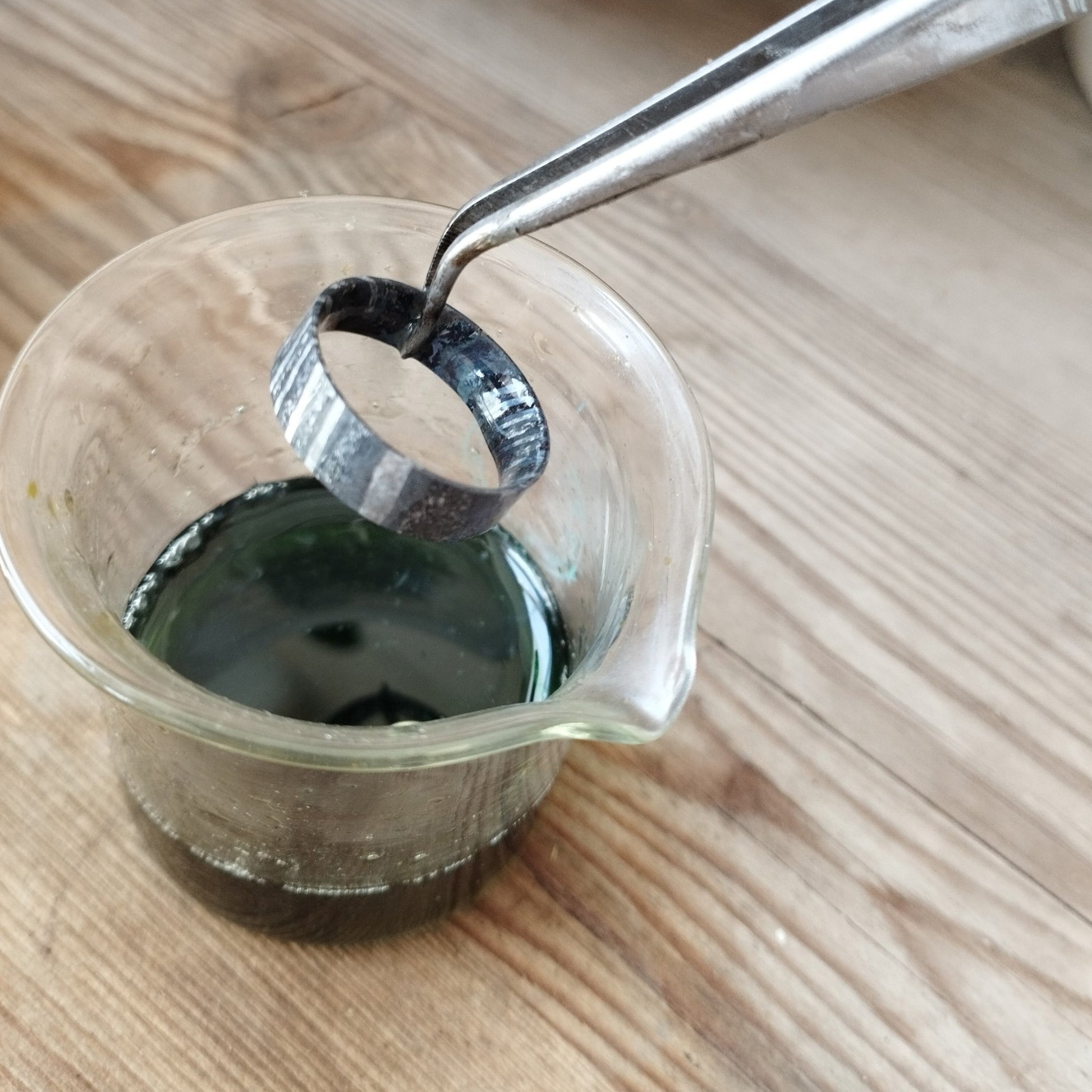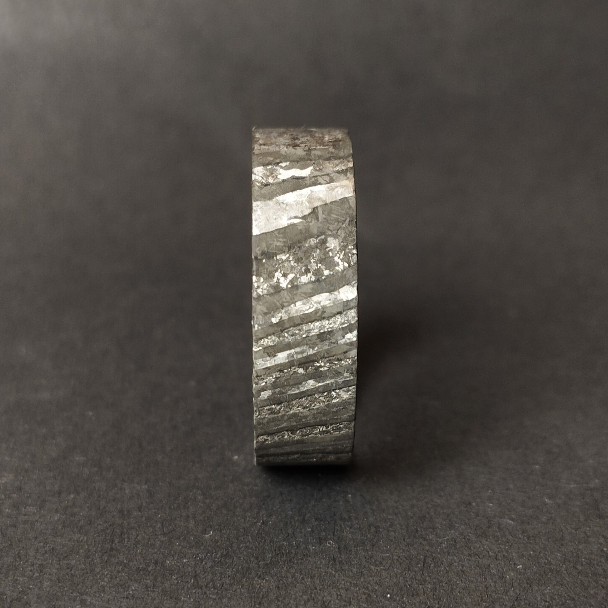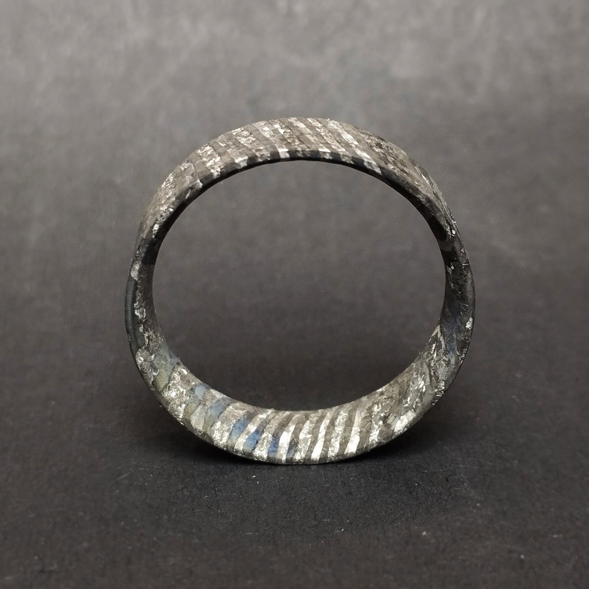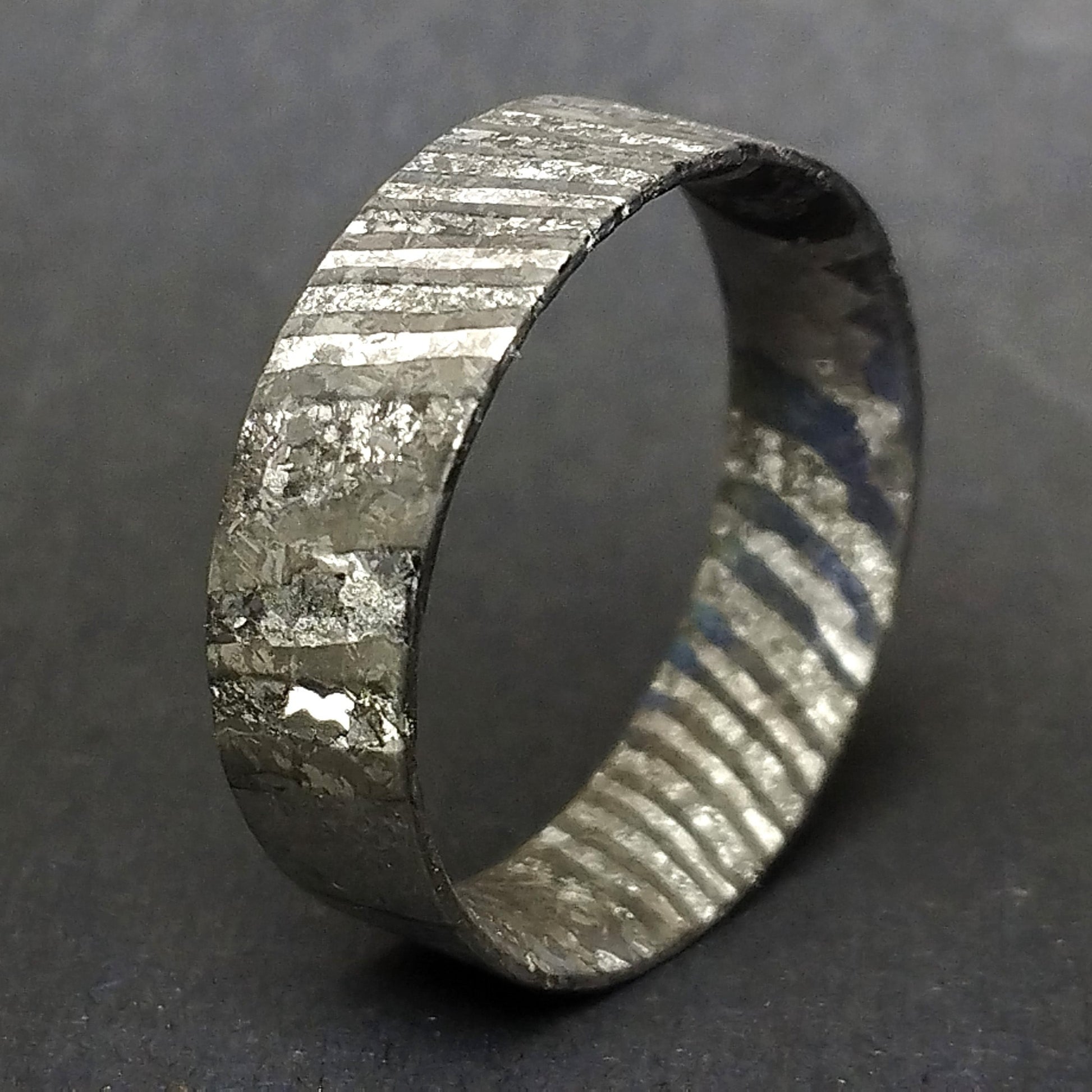 Timascus is a material created by folding 2 or more titanium alloys together, after the ring is ready it's etched in acid to reveal the unique pattern.