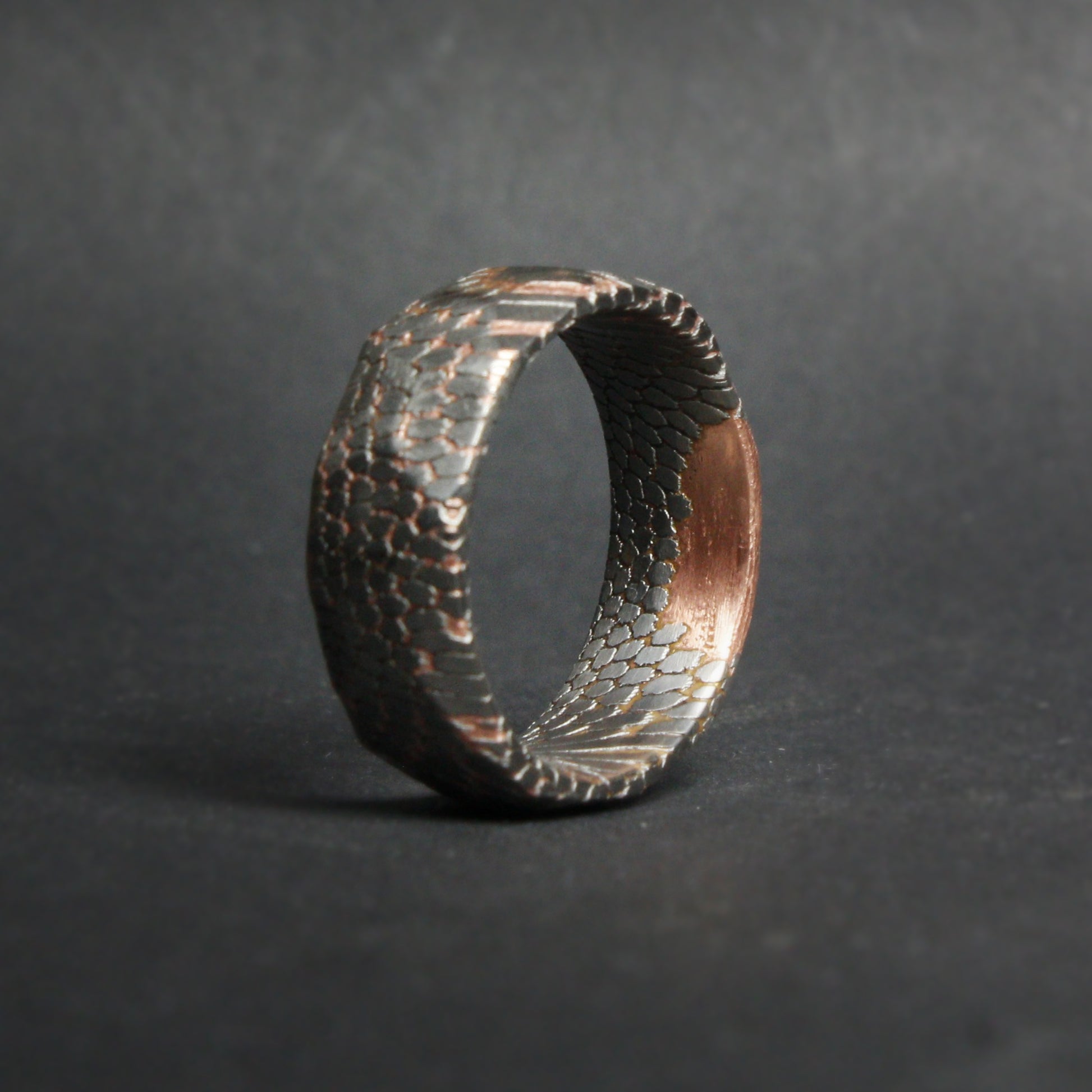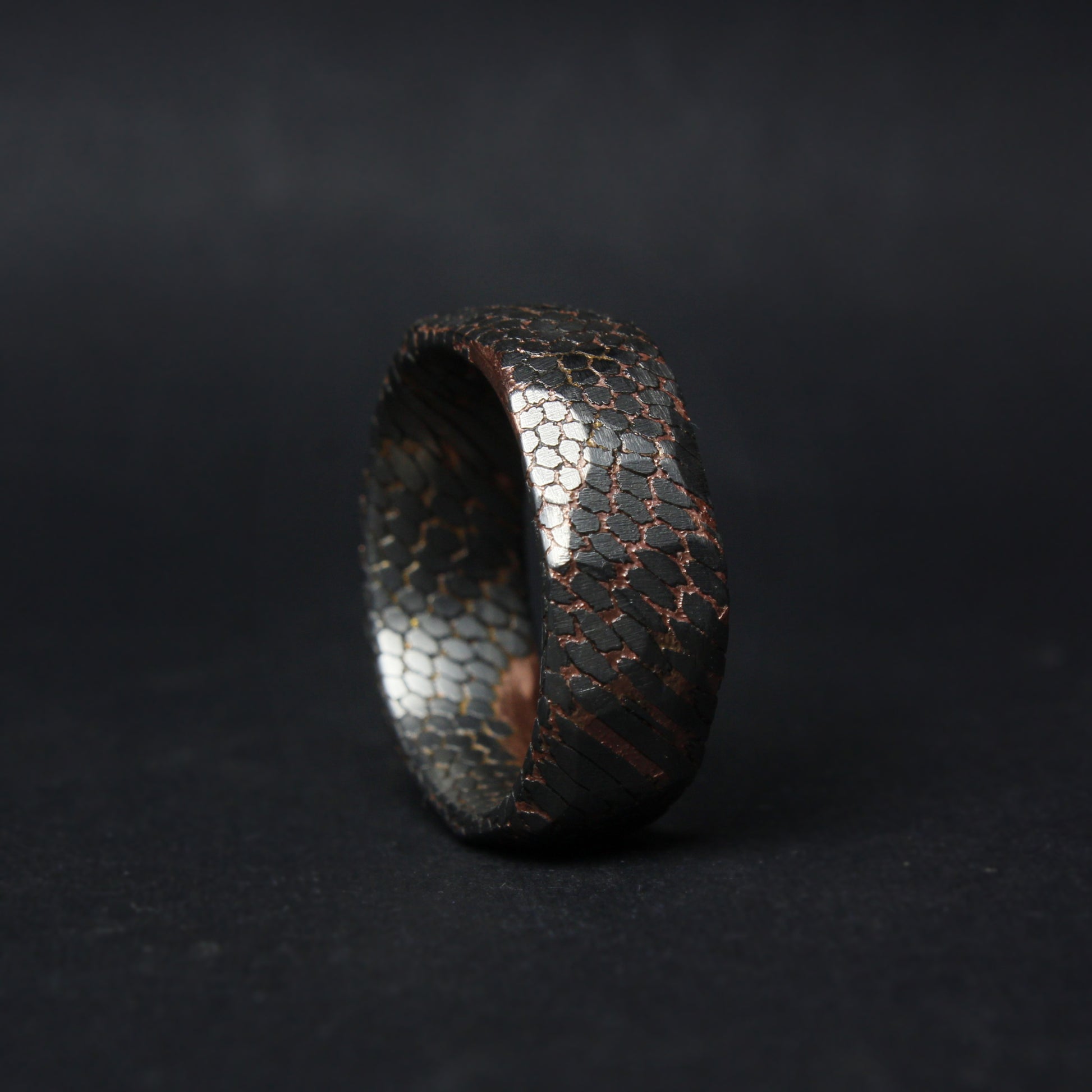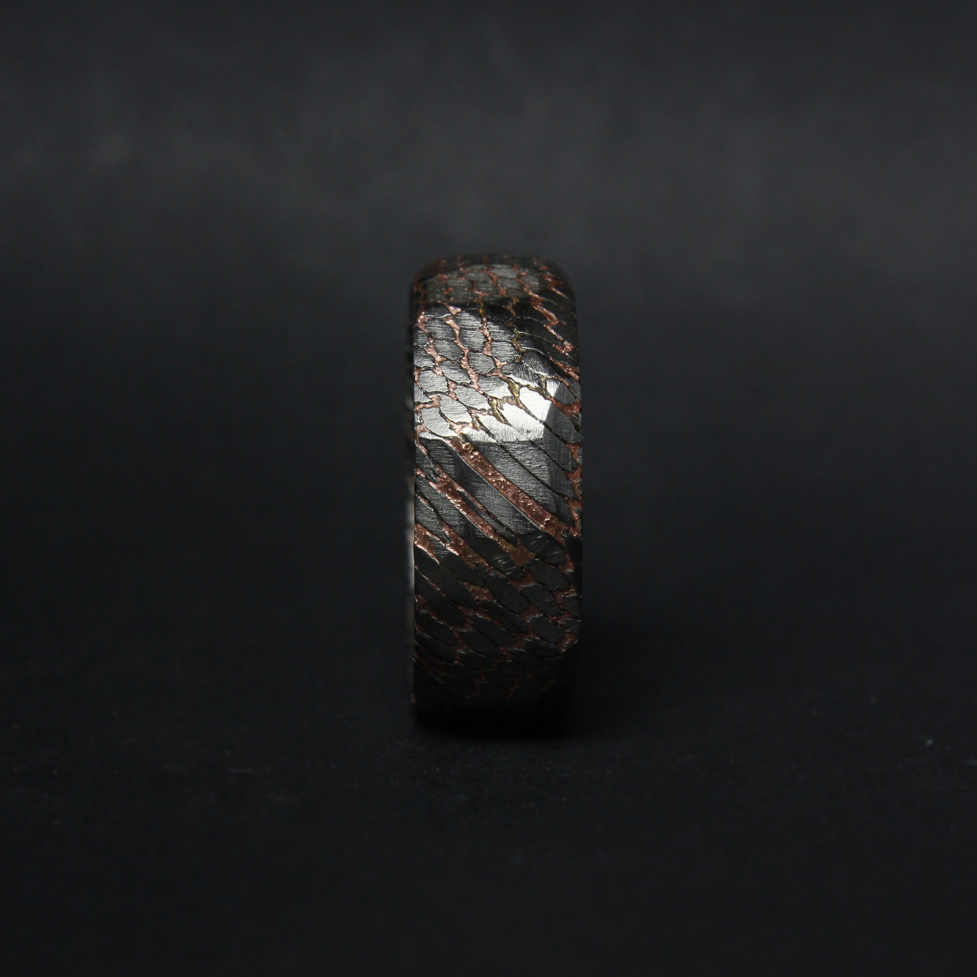 This listing is for a faceted deep etched superconductor - copper, and titanium-niobium ring.