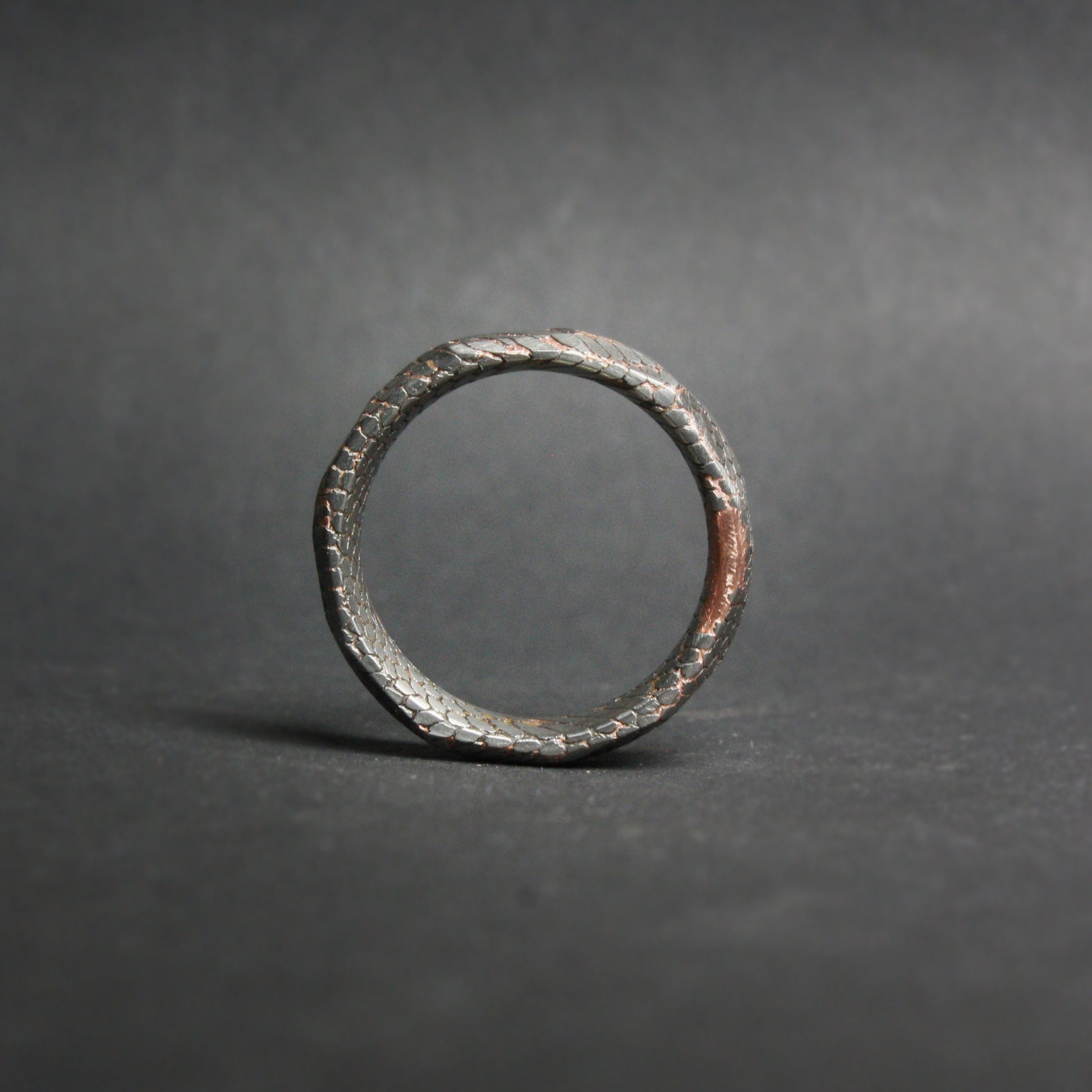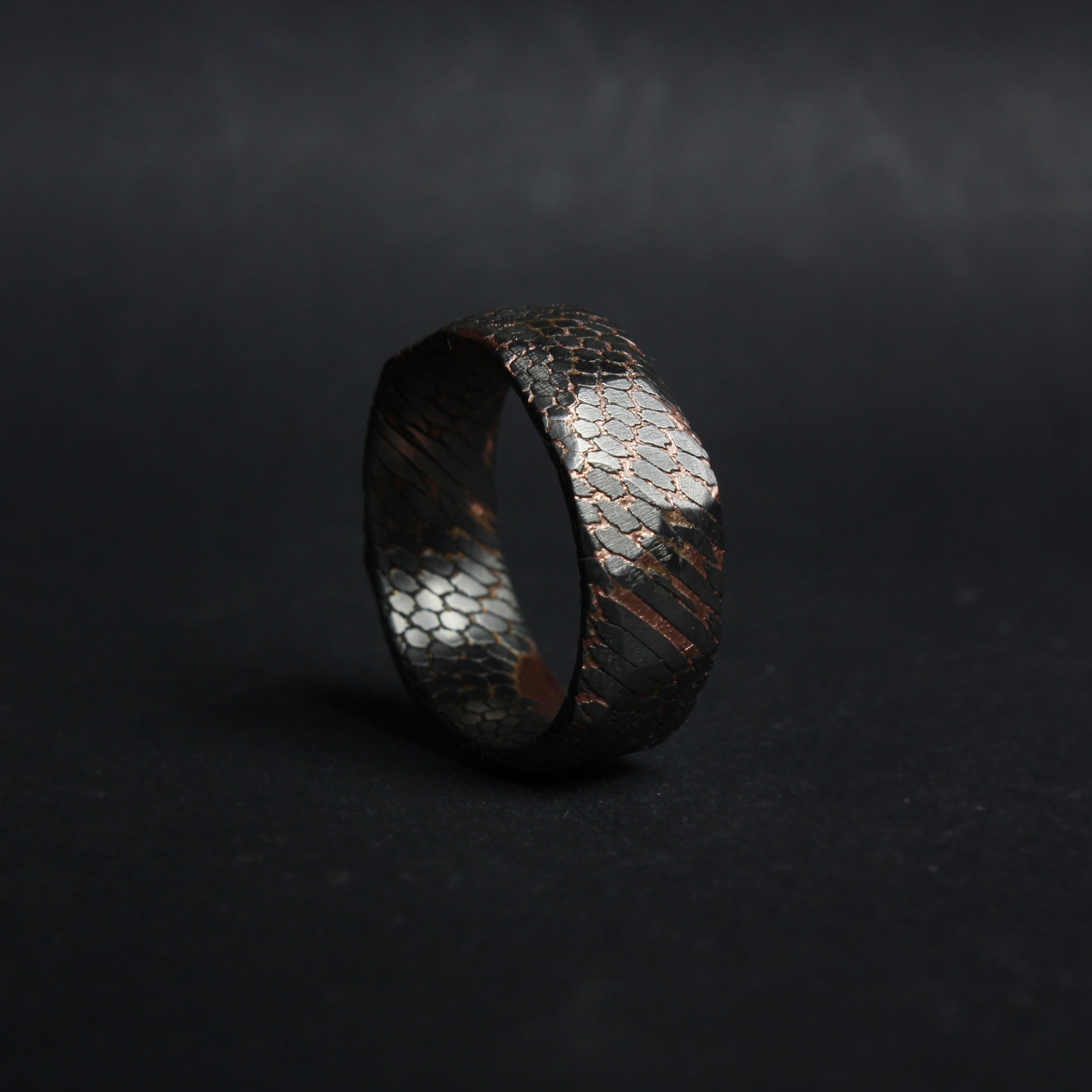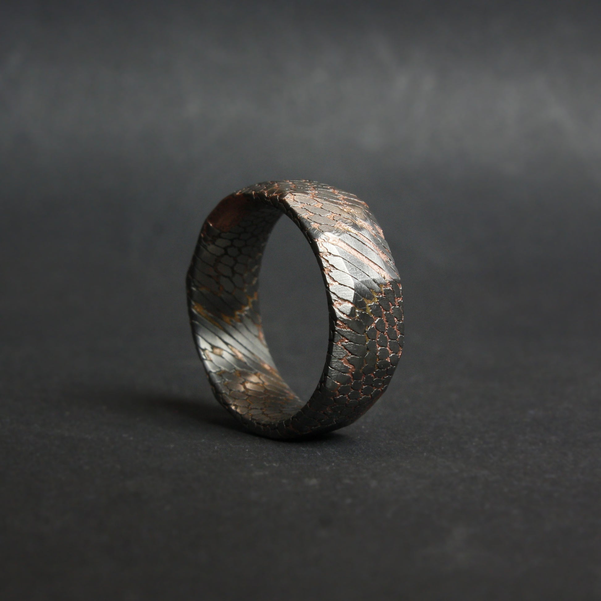 This listing is for a faceted deep etched superconductor - copper, and titanium-niobium ring.