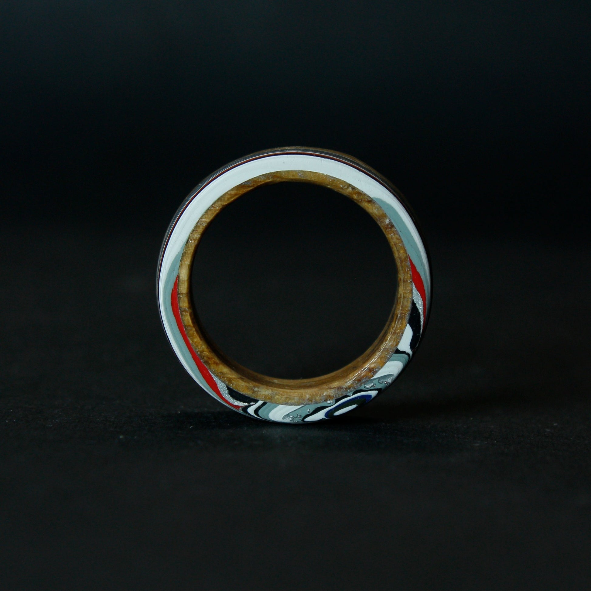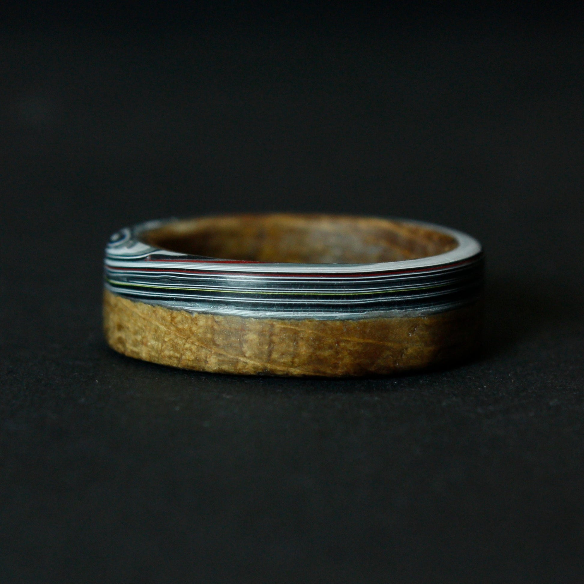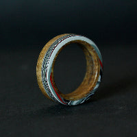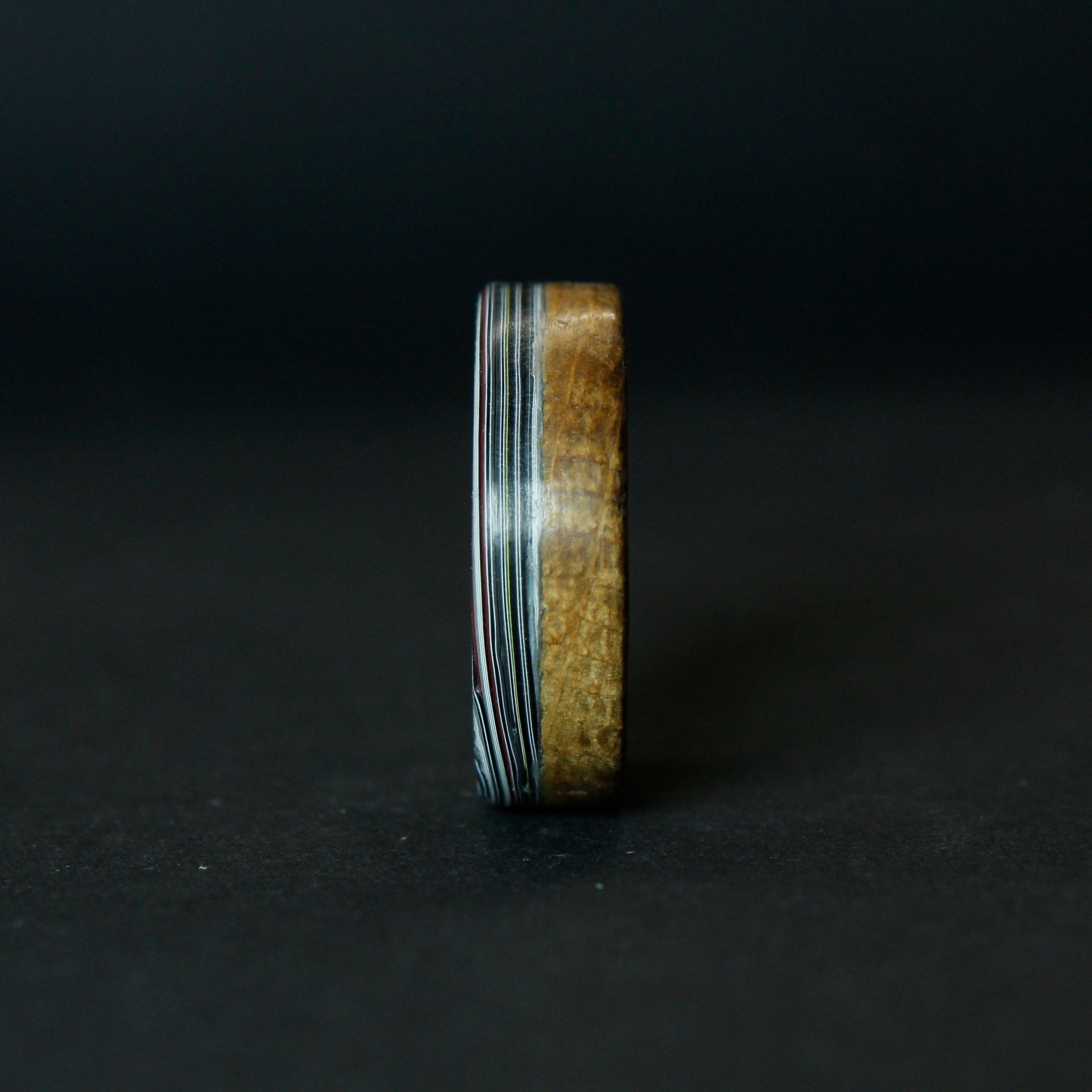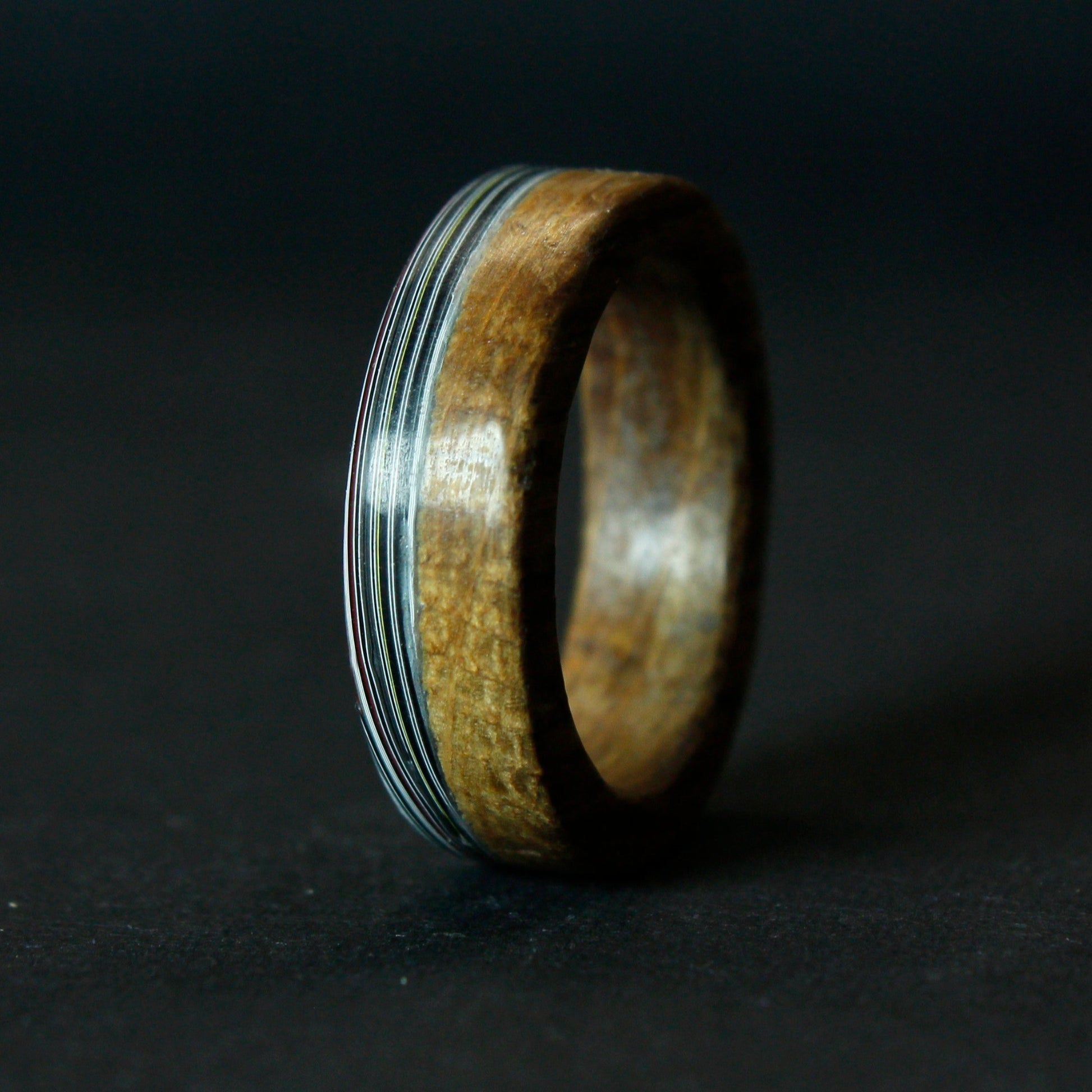 The wood in this ring was soaked with whiskey for a long time which gave it unique patterns.