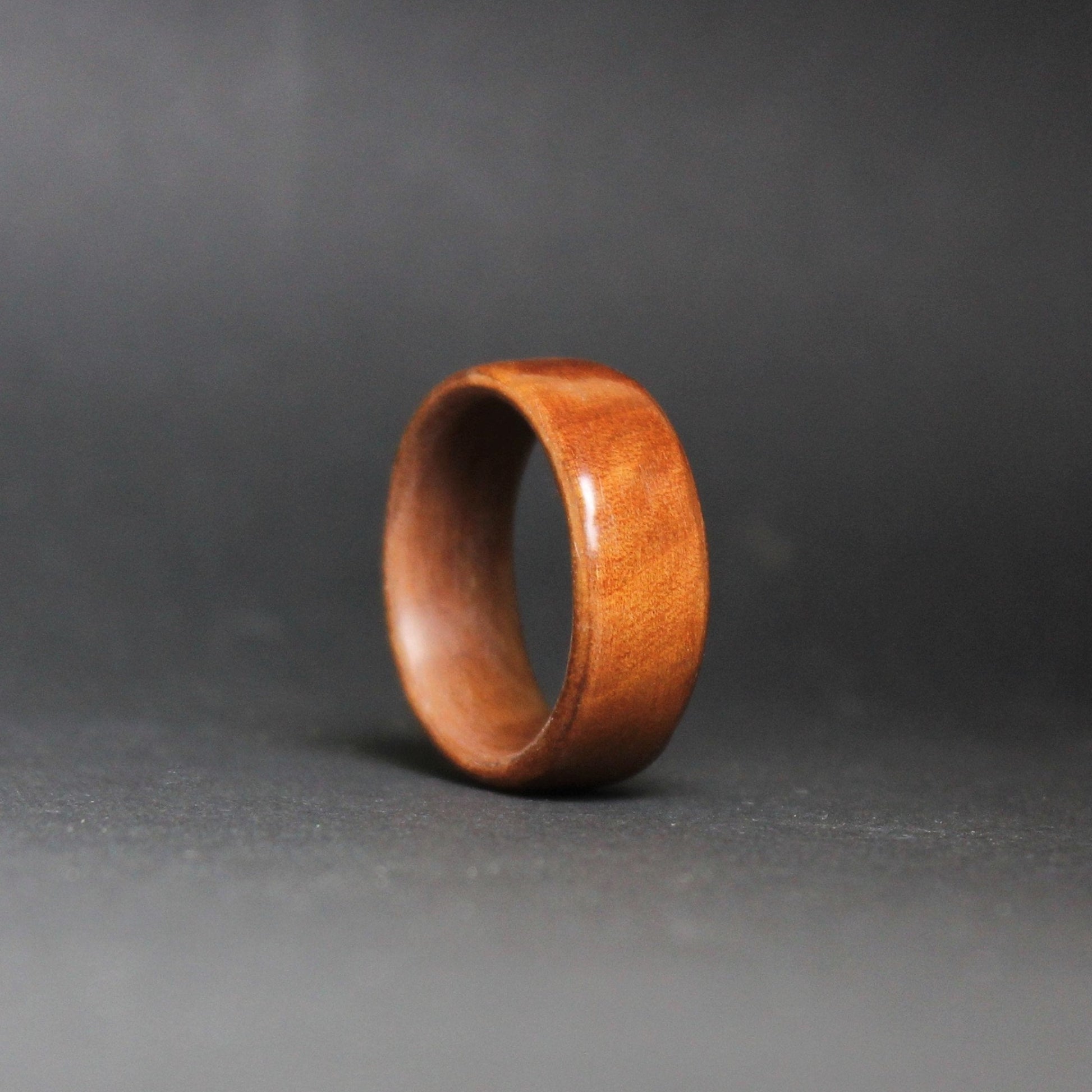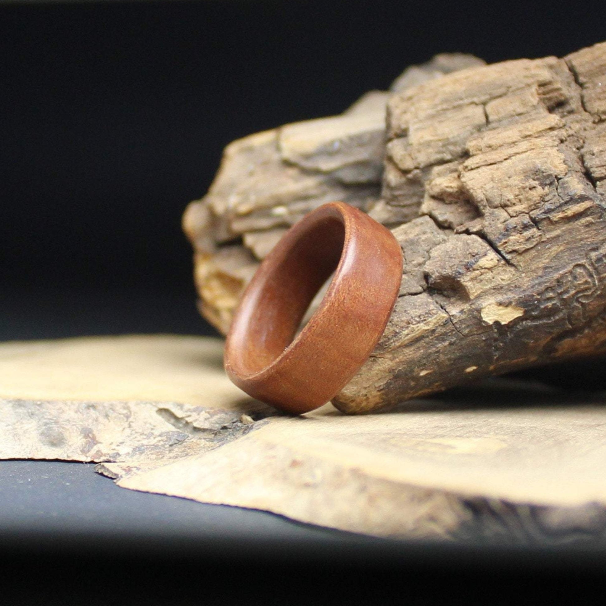 Your ring will be crafted in the bentwood method. In this process, the wood (veneer) is first steamed and bent so it can form a ring. After the veneer is dry it is carefully rolled with the grain direction creating a ring built out of several thin layers. This process gives the rings a very high strength and shows the natural grain of the wood. The ring is finally sanded to size and width, coated with several waterproof layers and polished by hand to the desired finish.