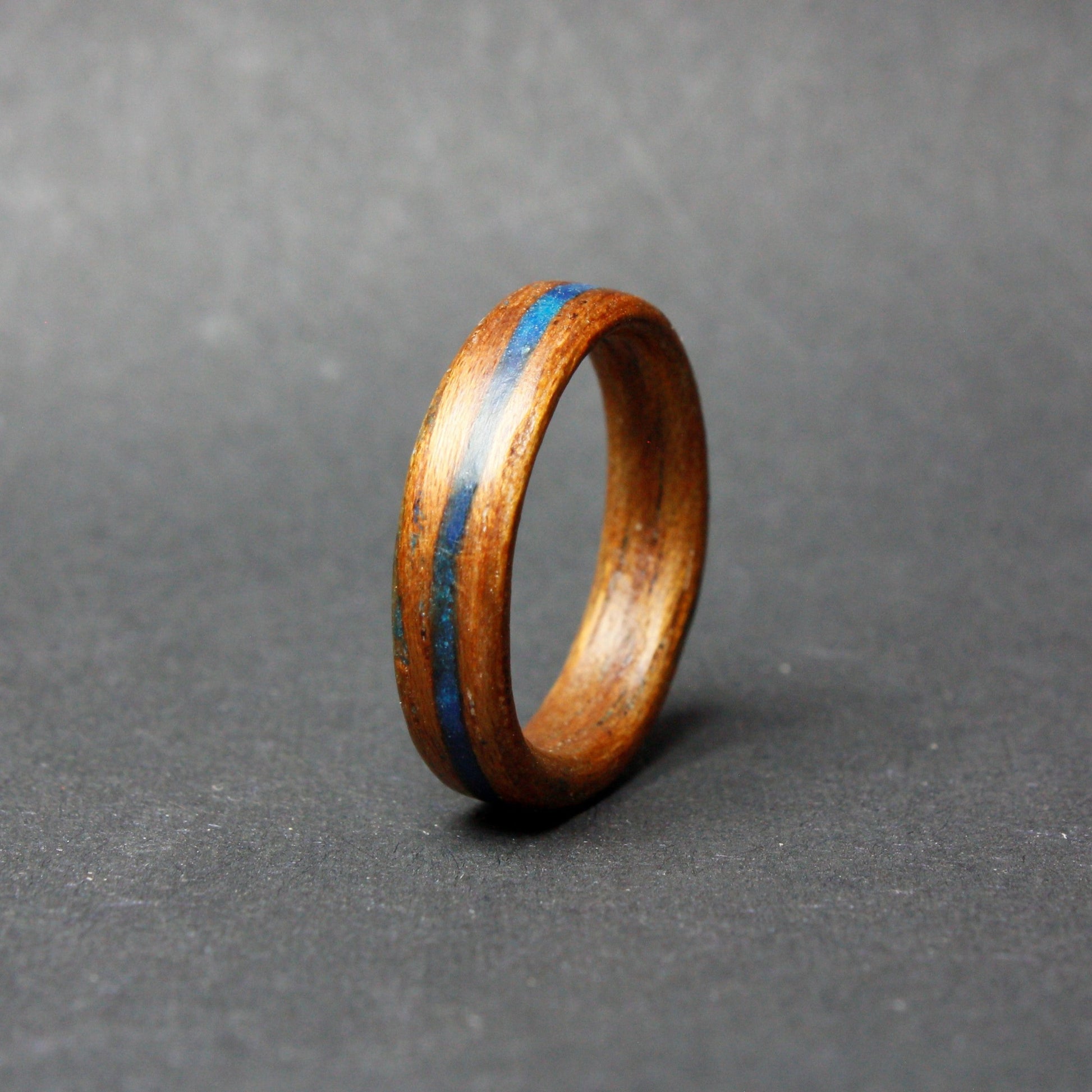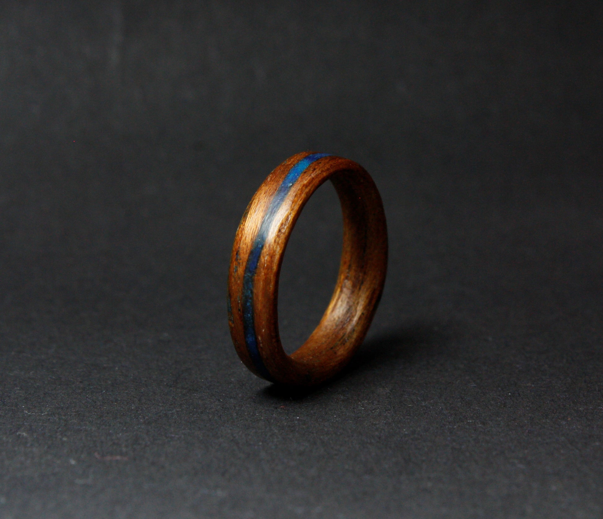 This listing is for a handmade ring made with natural mahogany veneer and blue glow in the dark powder.