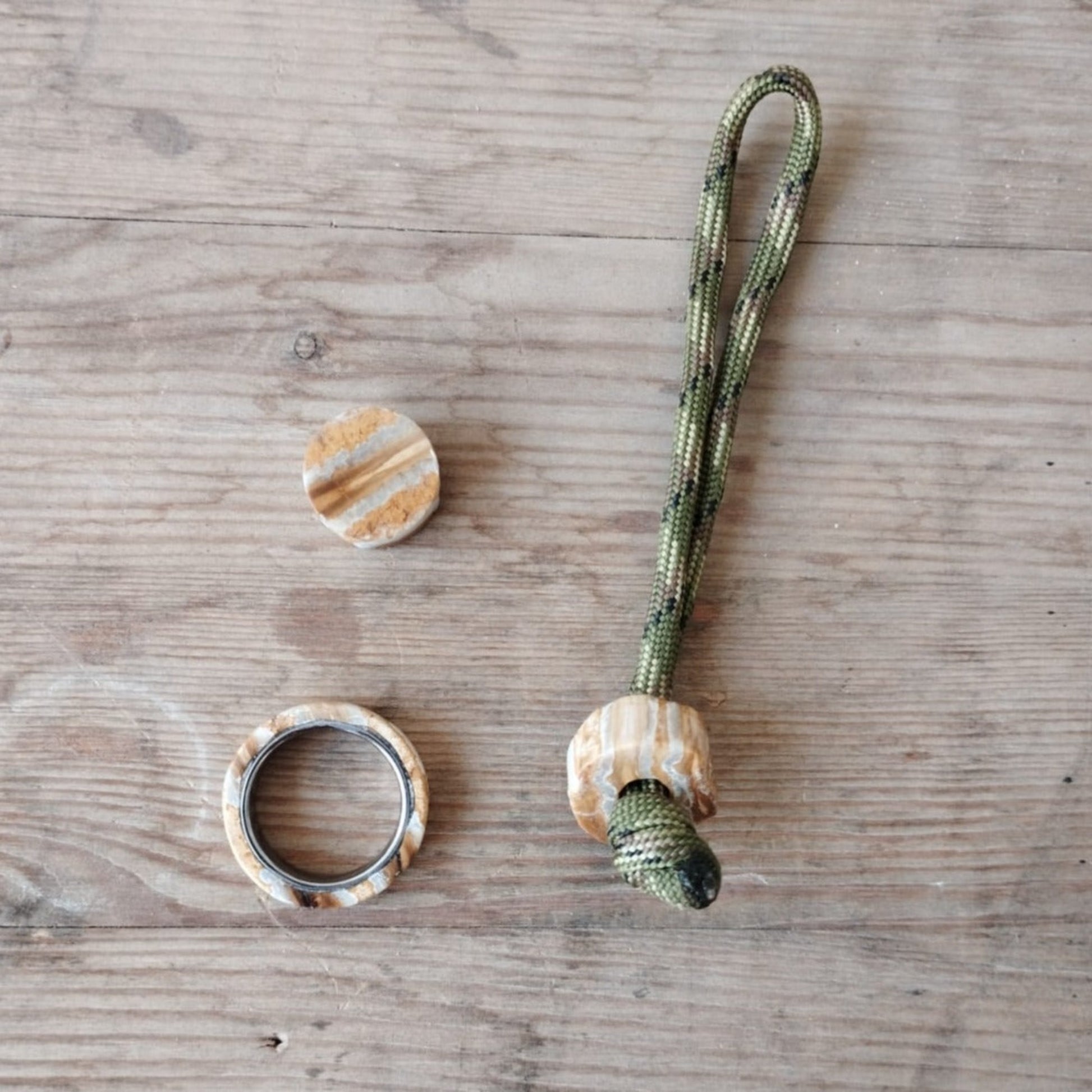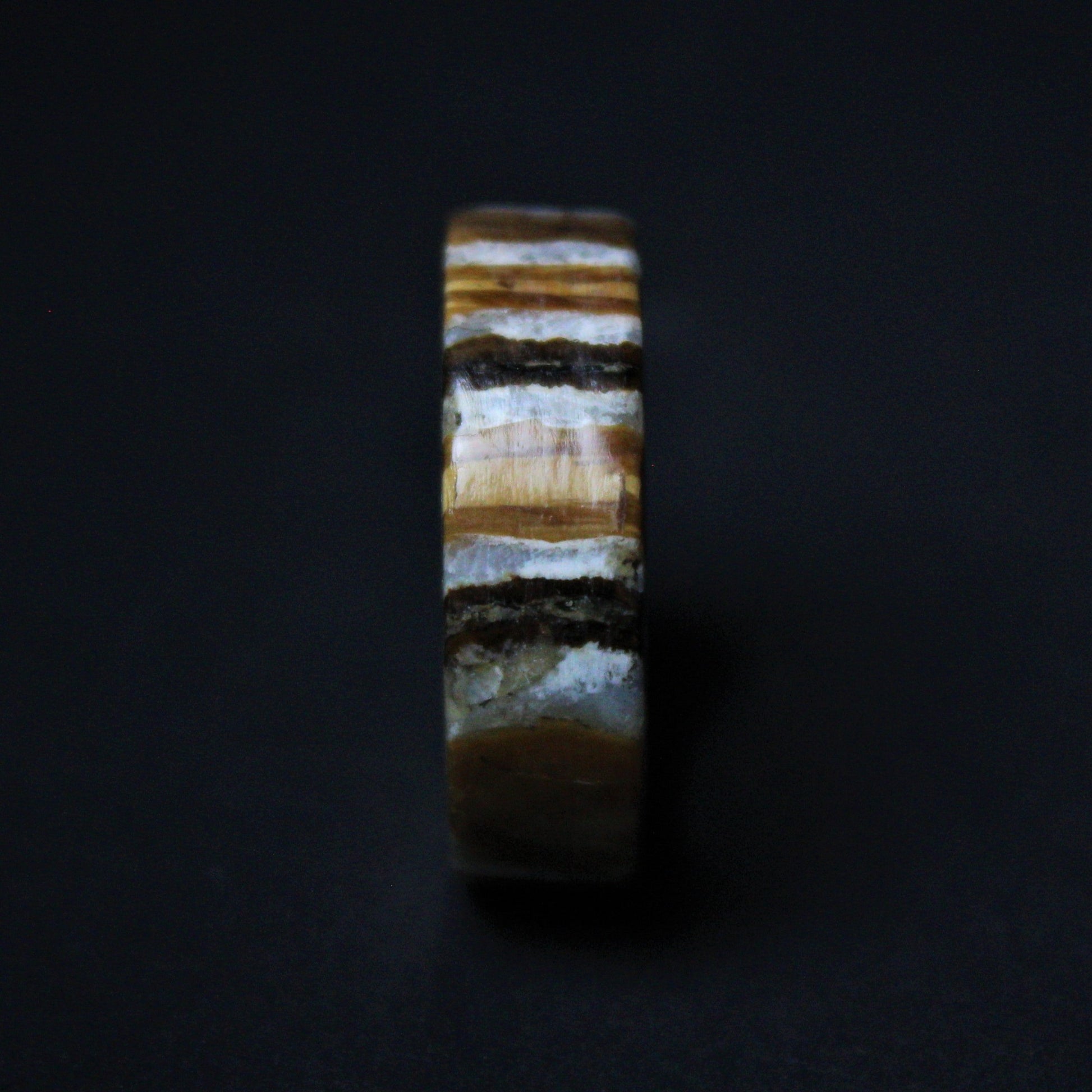 Mammoth tooth is a very tough material and working with it is very time-consuming since extra care is taken with each ring, the tooth is machined to its final size over many hours using special tools.