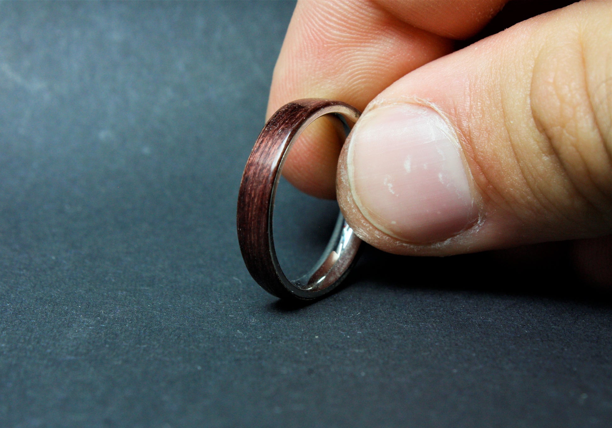 The wood layer is combined with the stainless steel liner by hand in a similar way to the bentwood method, this creates a strong and durable ring.