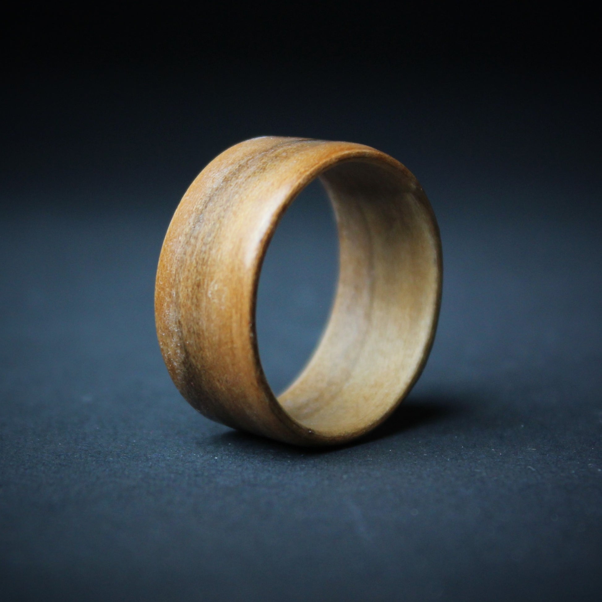 Your ring will be crafted in the bentwood method. In this process, the wood (veneer) is first steamed and bent so it can form a ring. After the veneer is dry it is carefully rolled with the grain direction creating a ring built out of several thin layers. This process gives the rings a very high strength and shows the natural grain of the wood. The ring is finally sanded to size and width, coated with several waterproof layers and polished by hand to the desired finish.