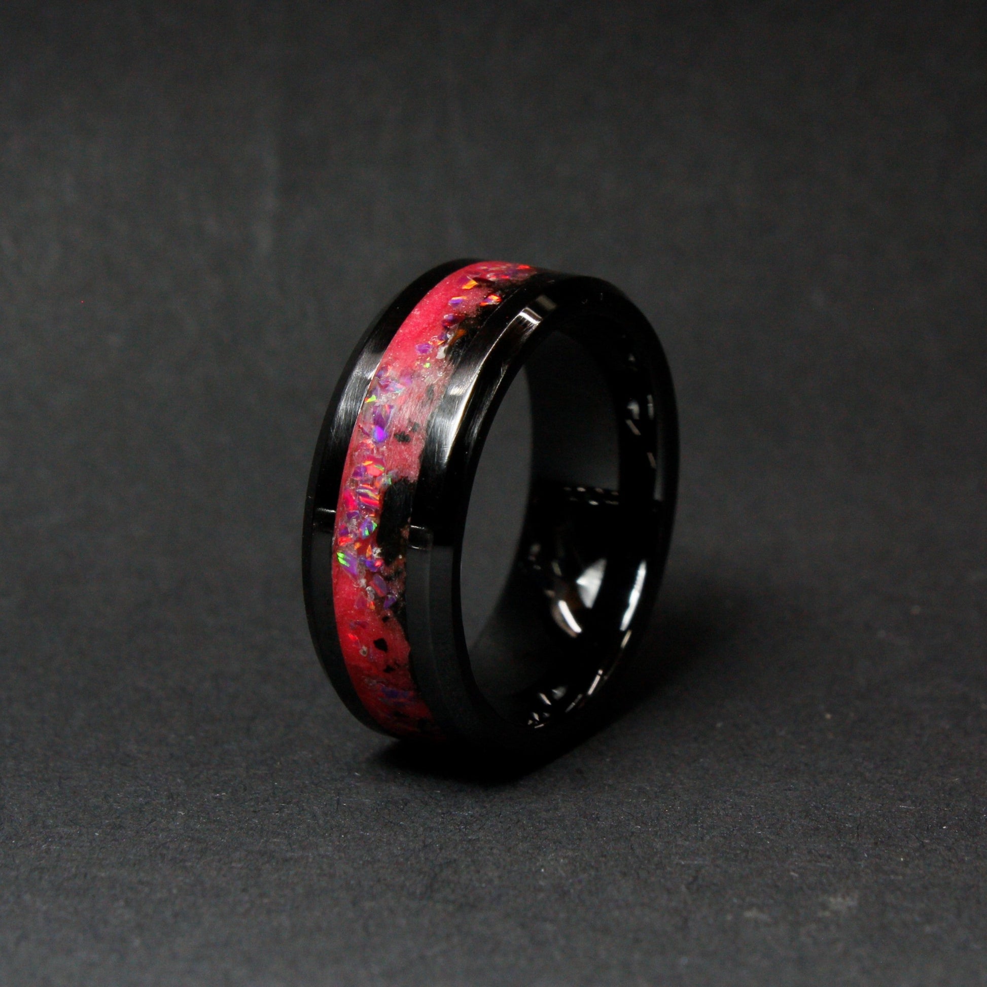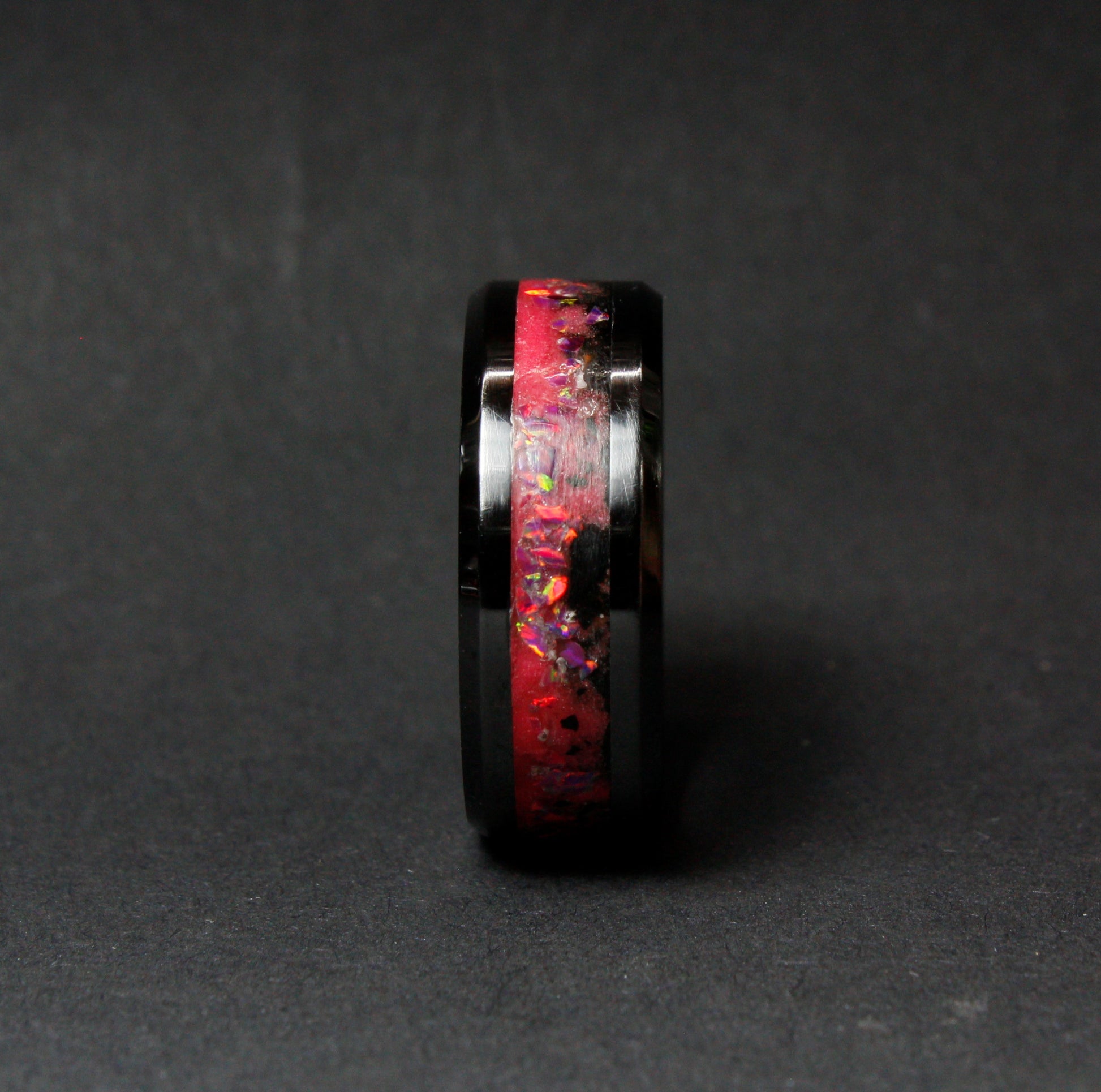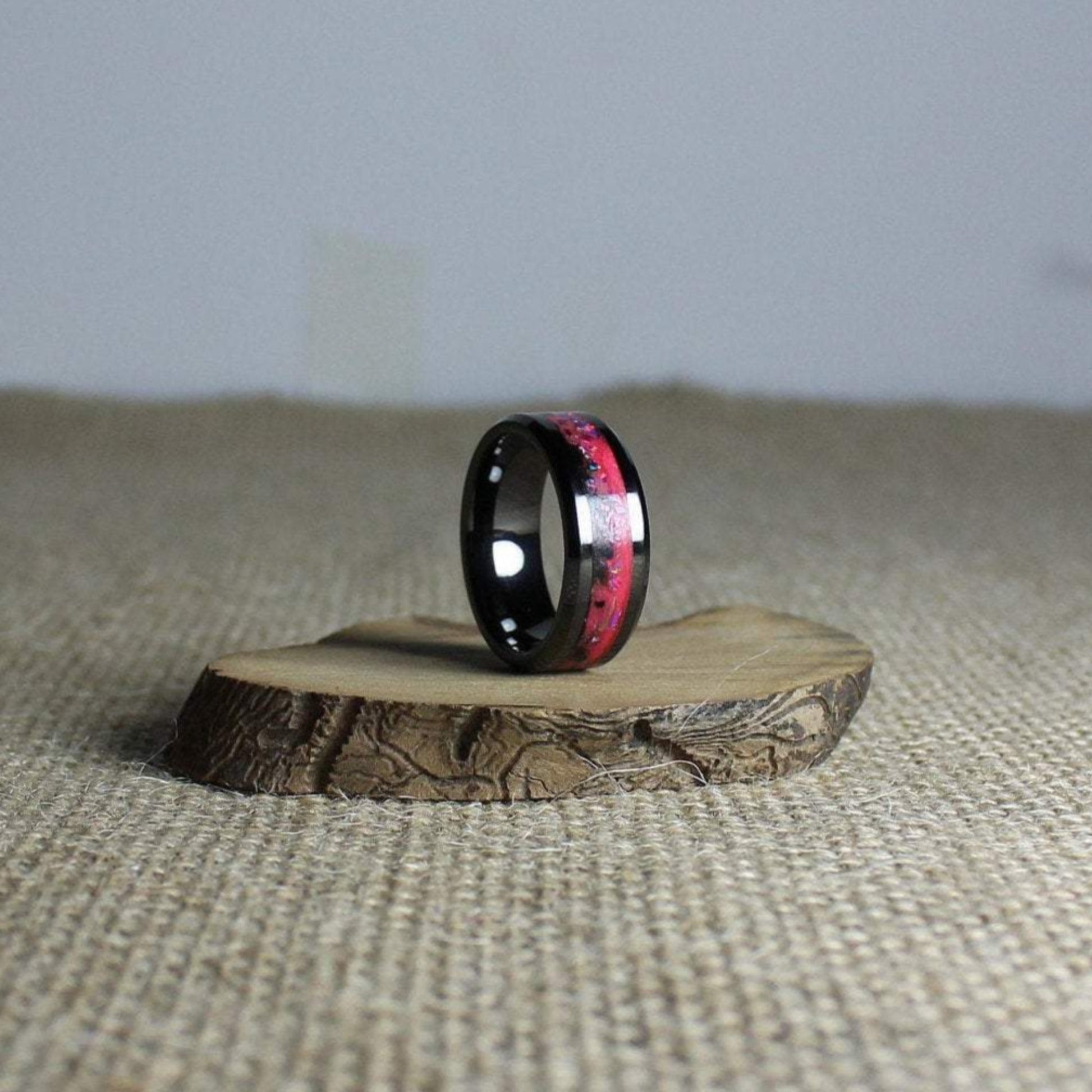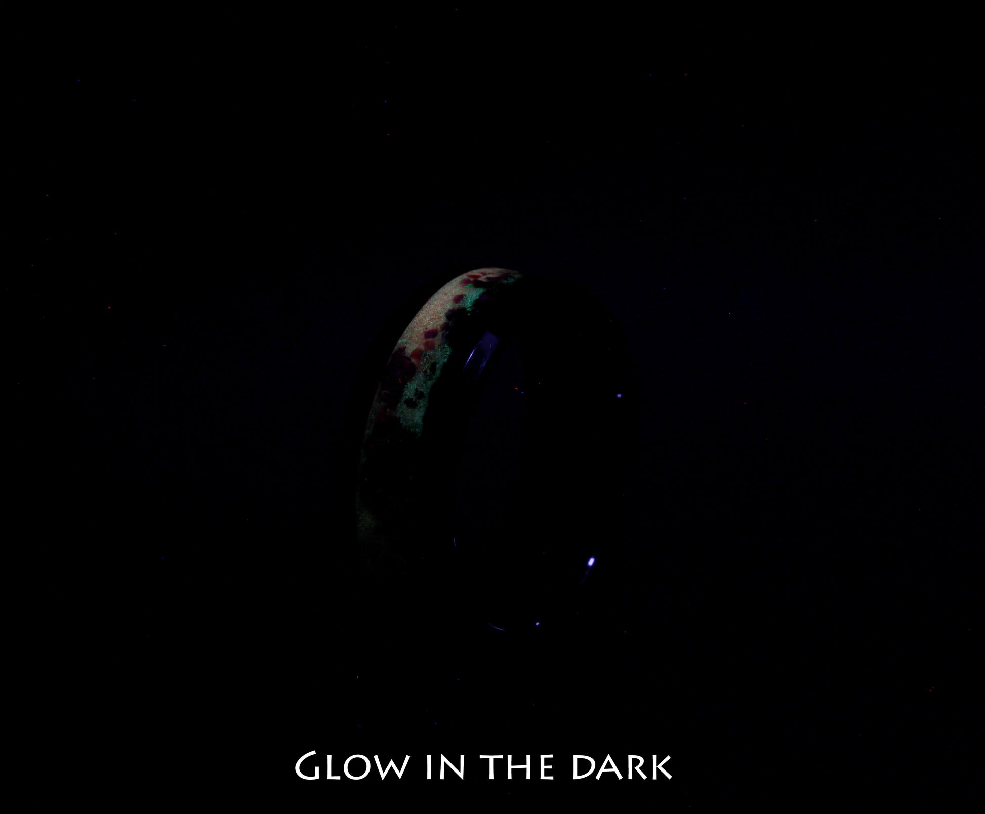 The ring is made with a ceramic core which is a very strong and scratch-proof material, a mix of crushed lab opal, crushed carbon stone and glow-powders is inlaid to the core to gain its special look.