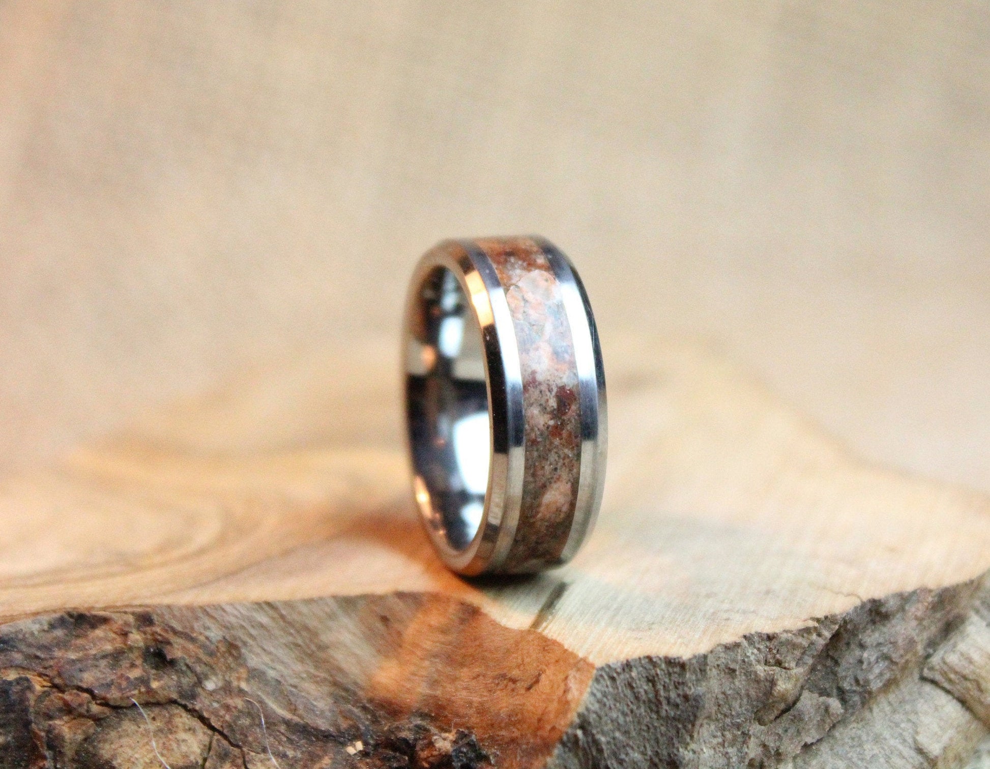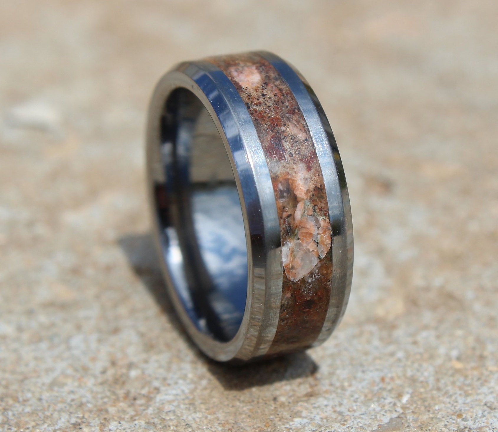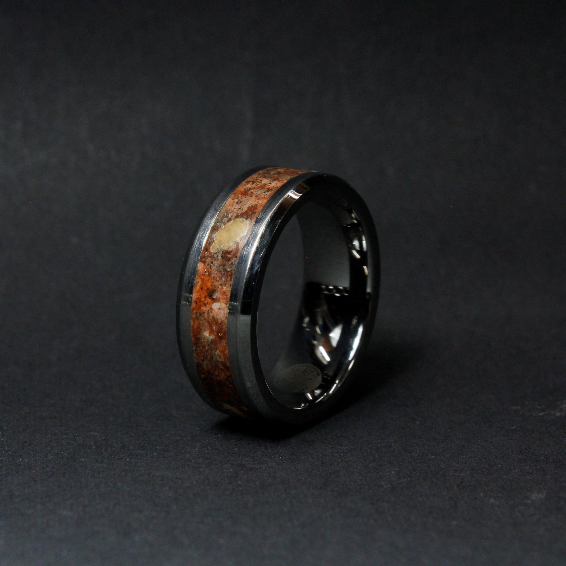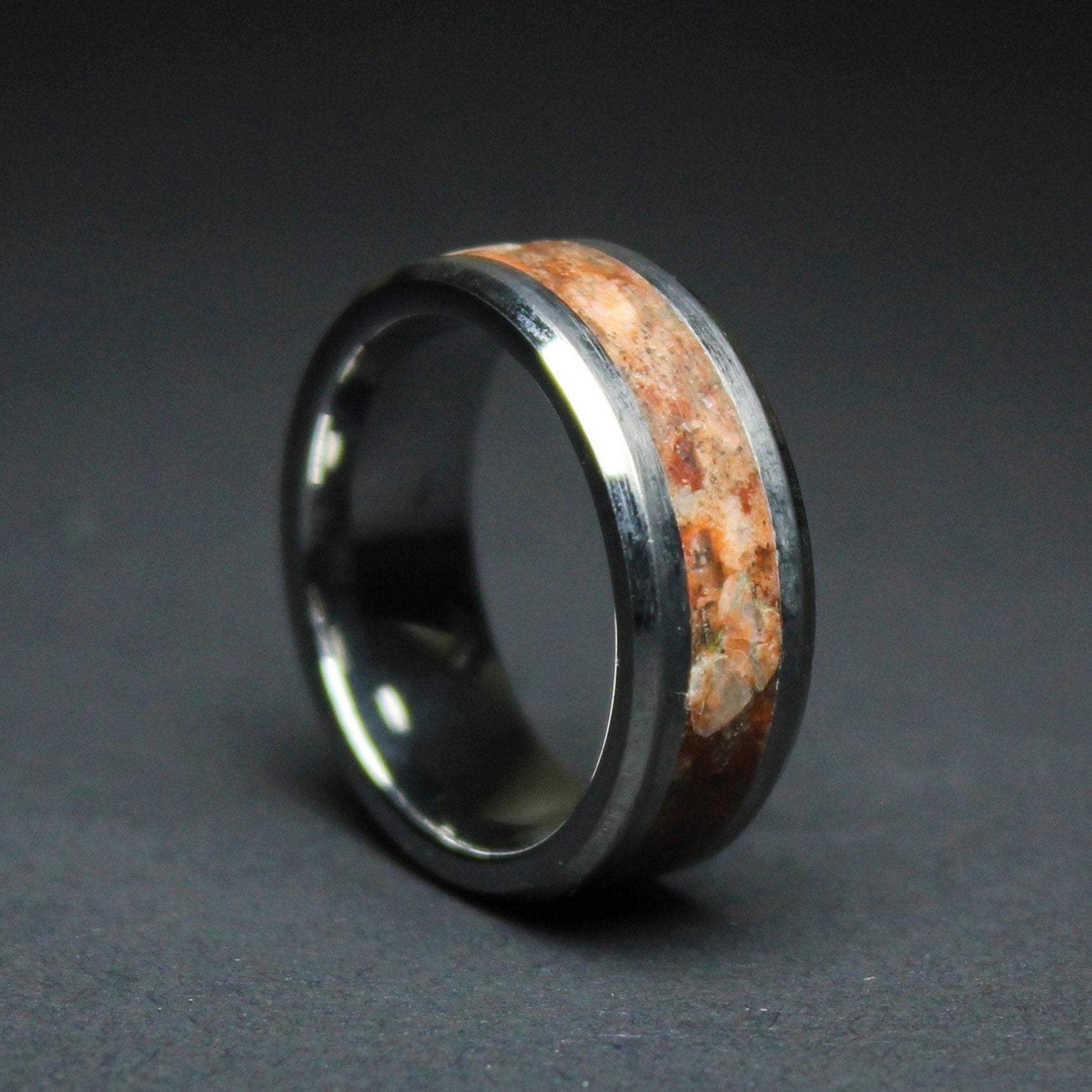 The ring is made with a tungsten carbide core which is a very strong and scratch-proof material, a mix of black sand from Sri Lanka, red volcanic stone, Quartz from Sri Lanka, red granite stone and glow powders are inlaid to the core to gain its special look.