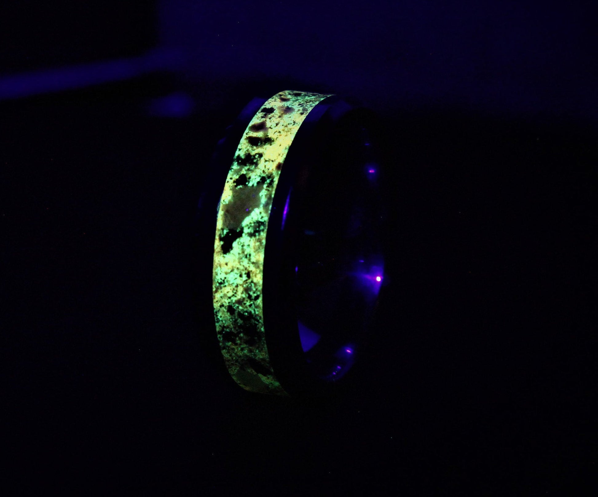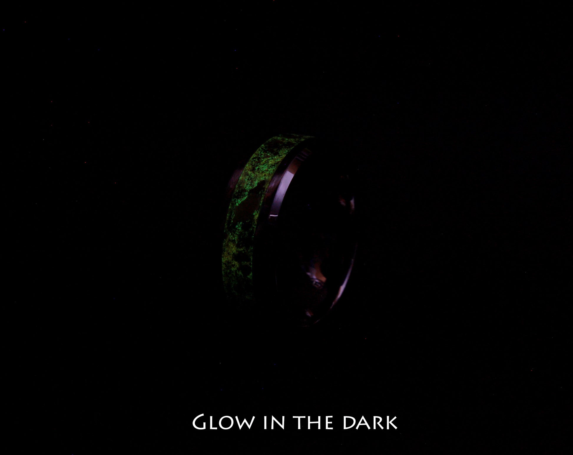For the ring to glow it needs to be charged with light (the glowing photos above was taken with long exposure and under a UV light to enhance the glow and to demonstrate the color).