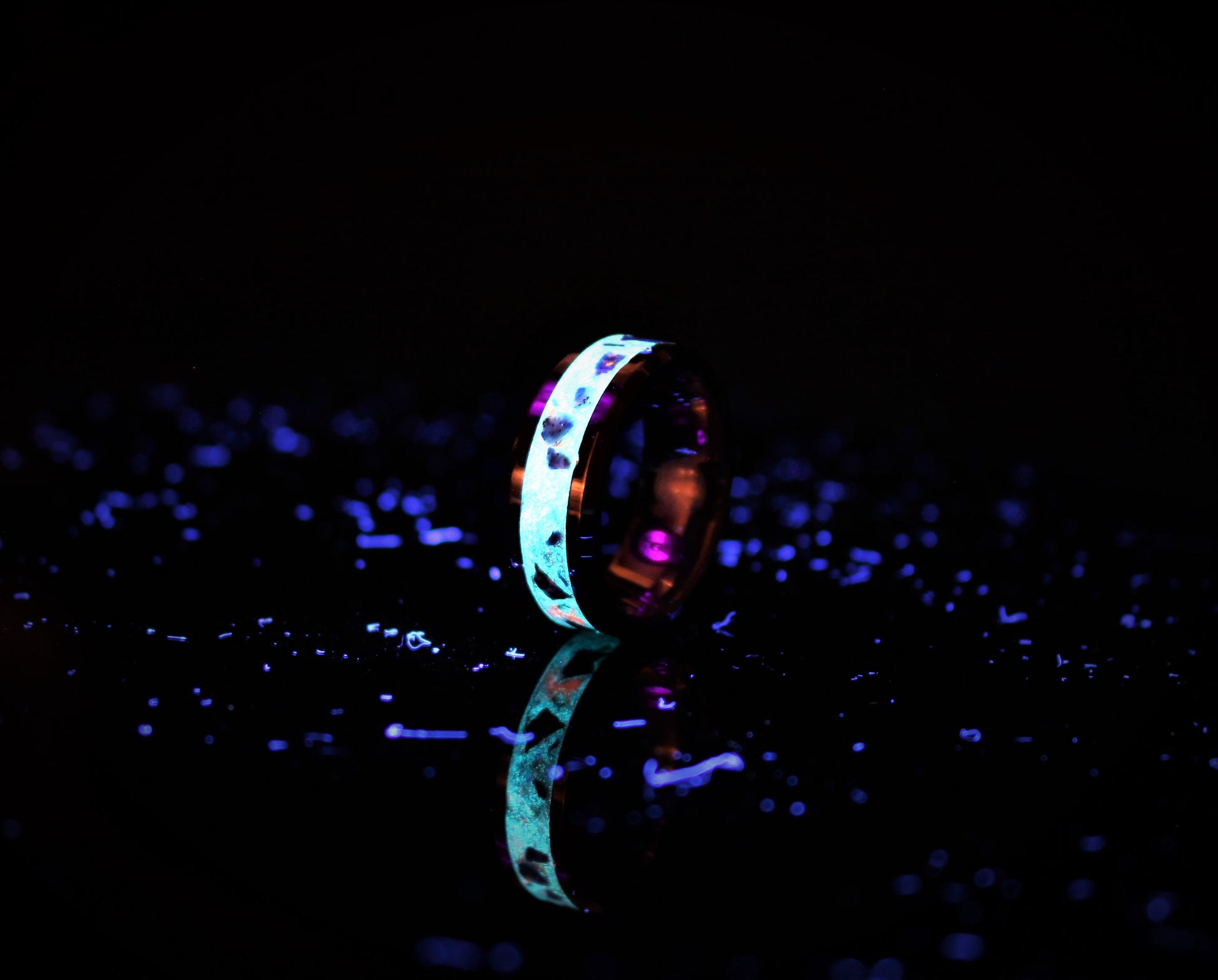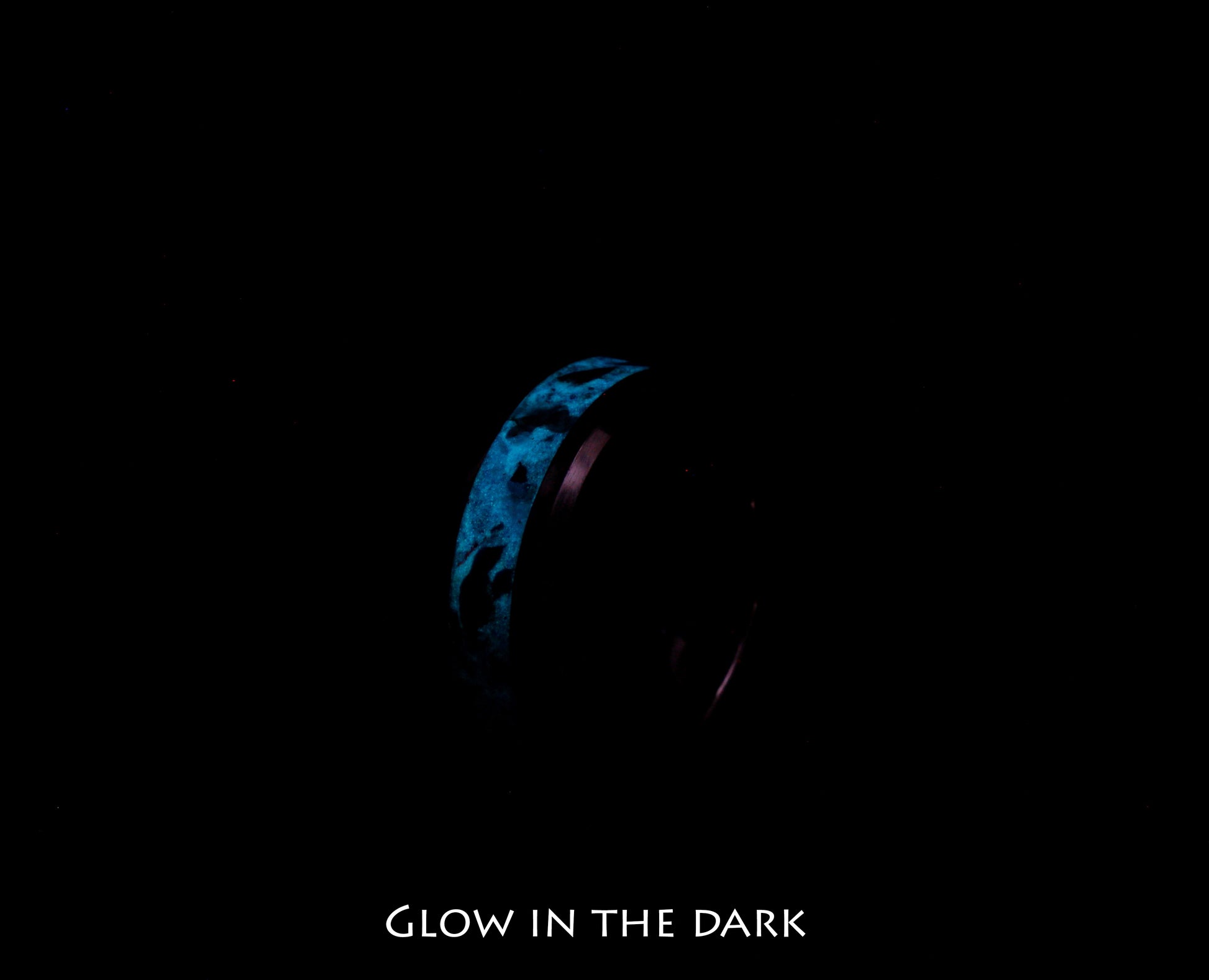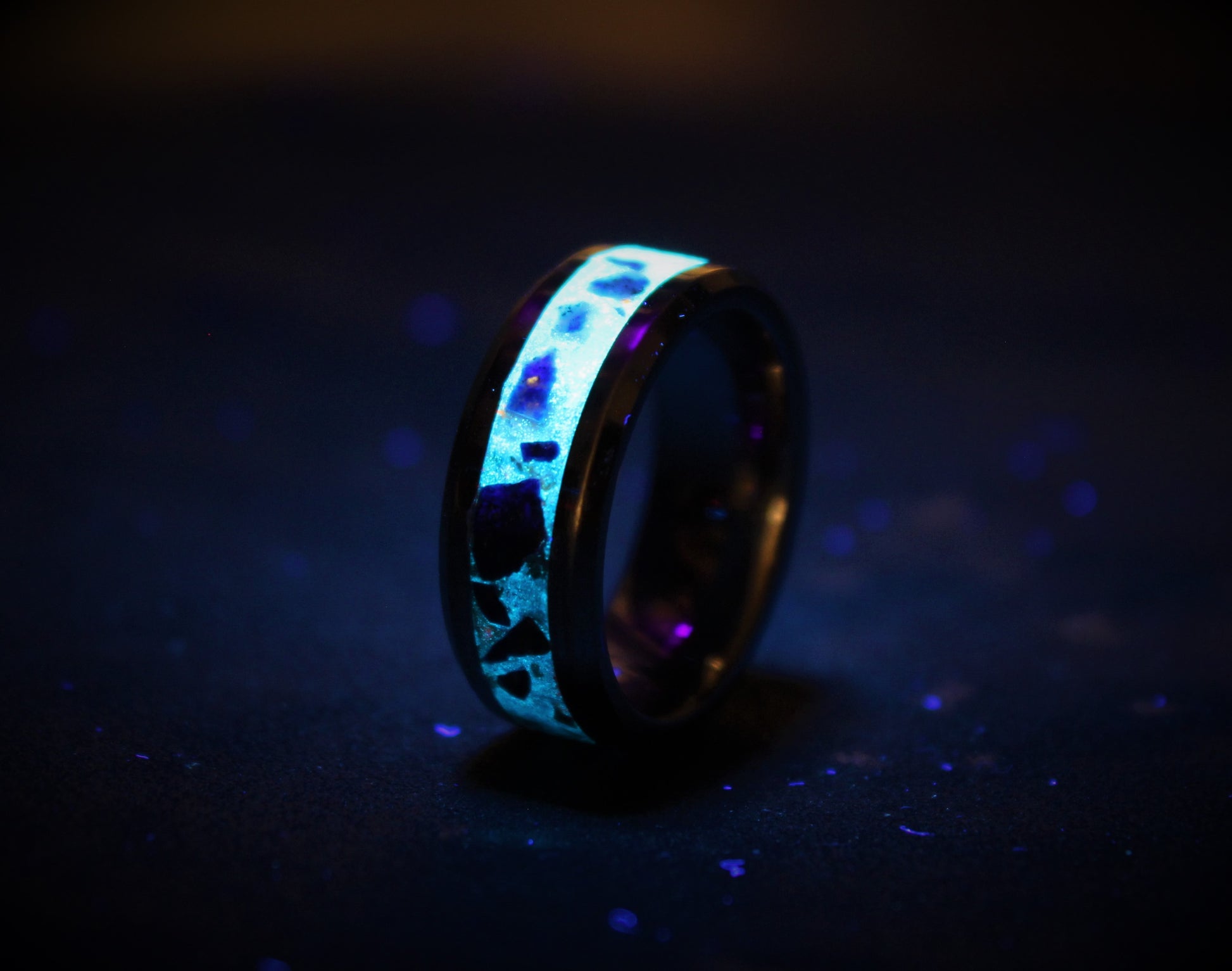 The ring is made with a tungsten carbide core which is a very strong and scratch-proof material, a mix of lapis lazuli and glow-powders is inlaid to the core to gain its special look.