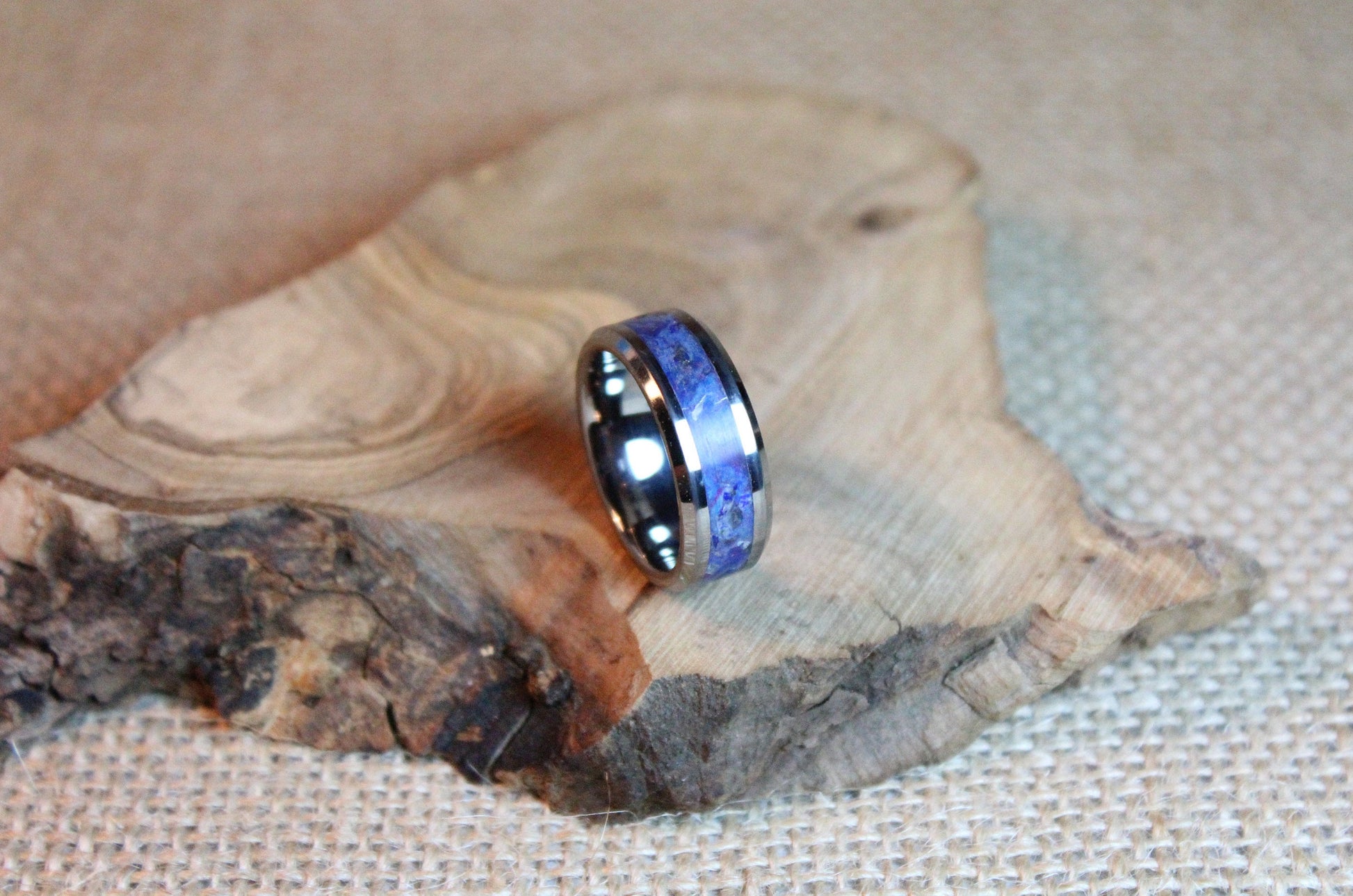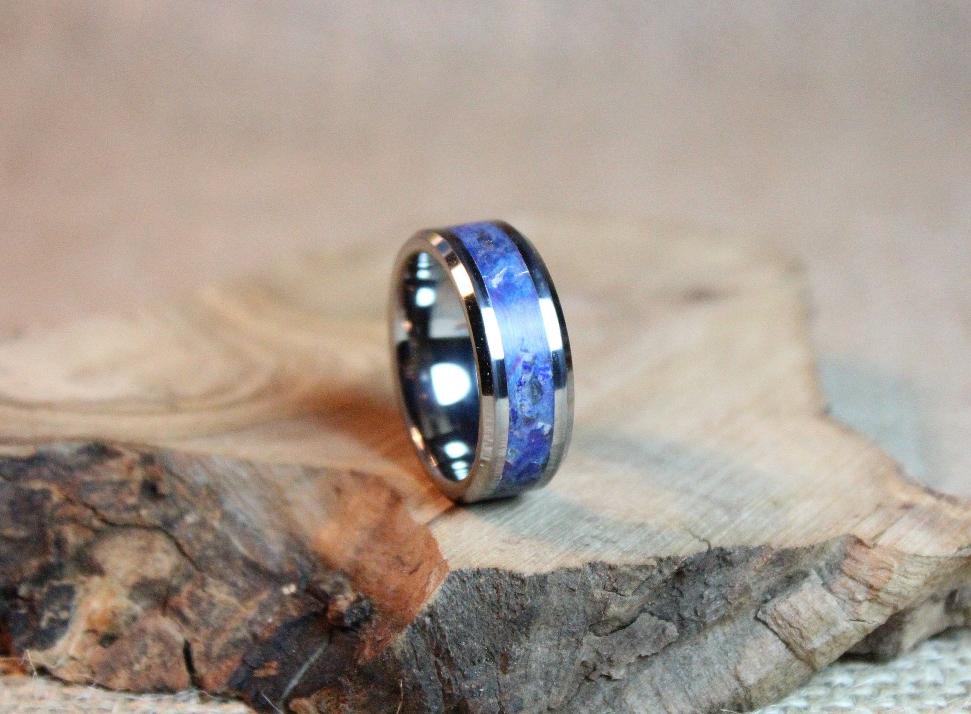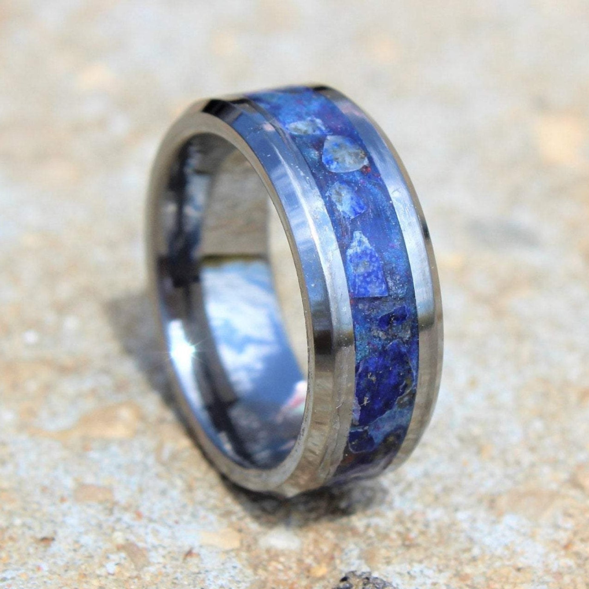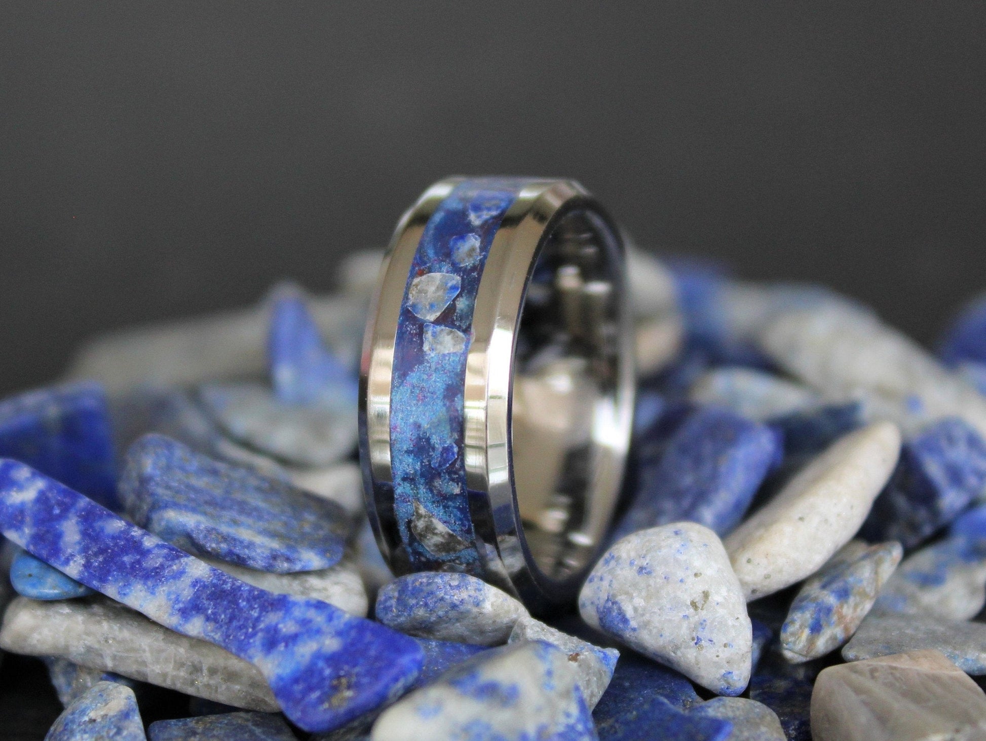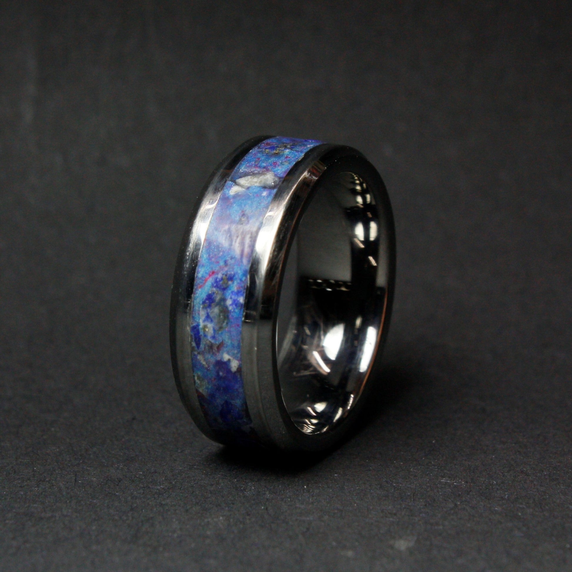 The tungsten carbide has a shiny silver - grey color and the inlay has a blue color with dark blue and white spots.