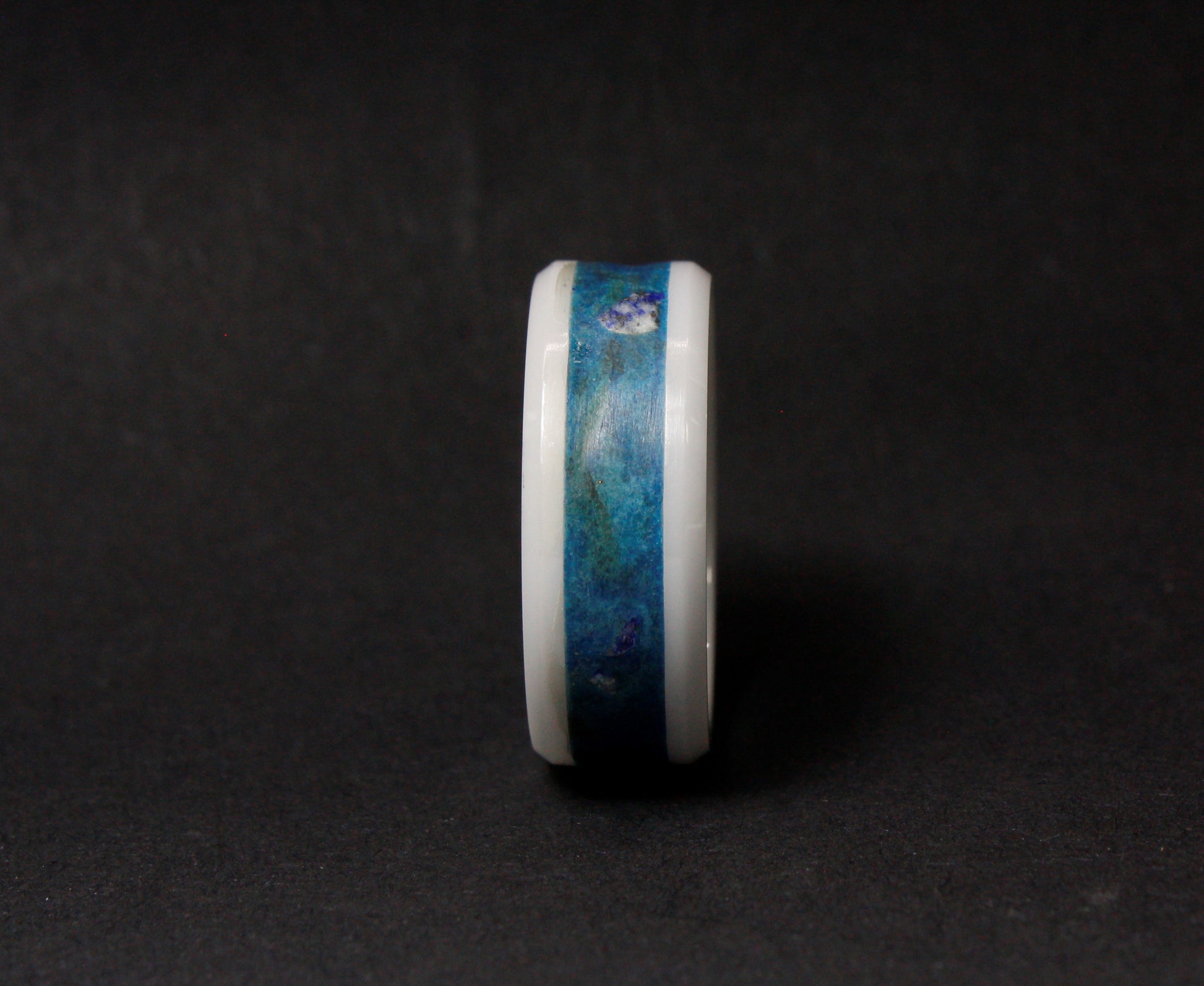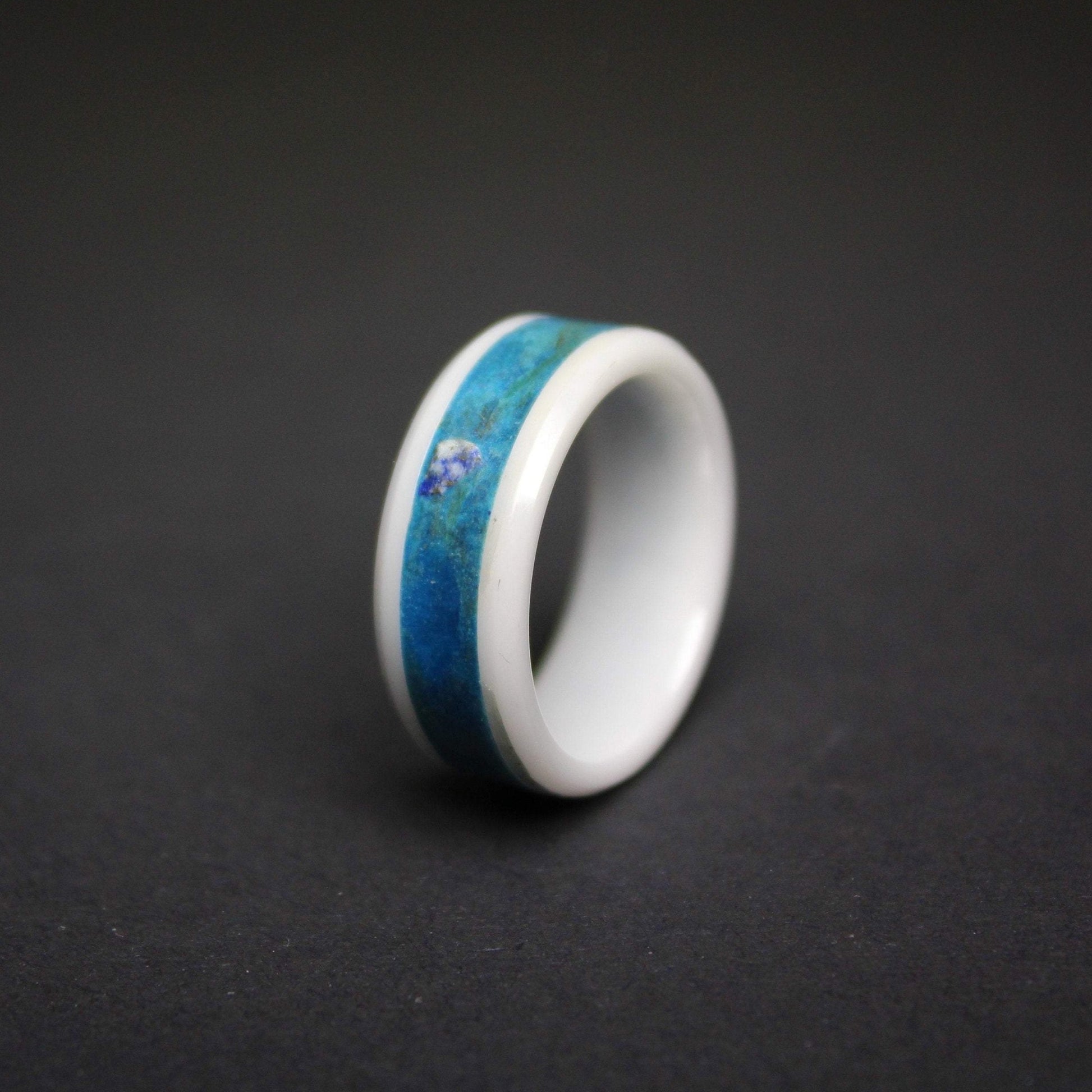 The ring is made with a ceramic core which is a very strong and scratch-proof material, a mix of lapis lazuli and glow-powders is inlaid to the core to gain its special look.