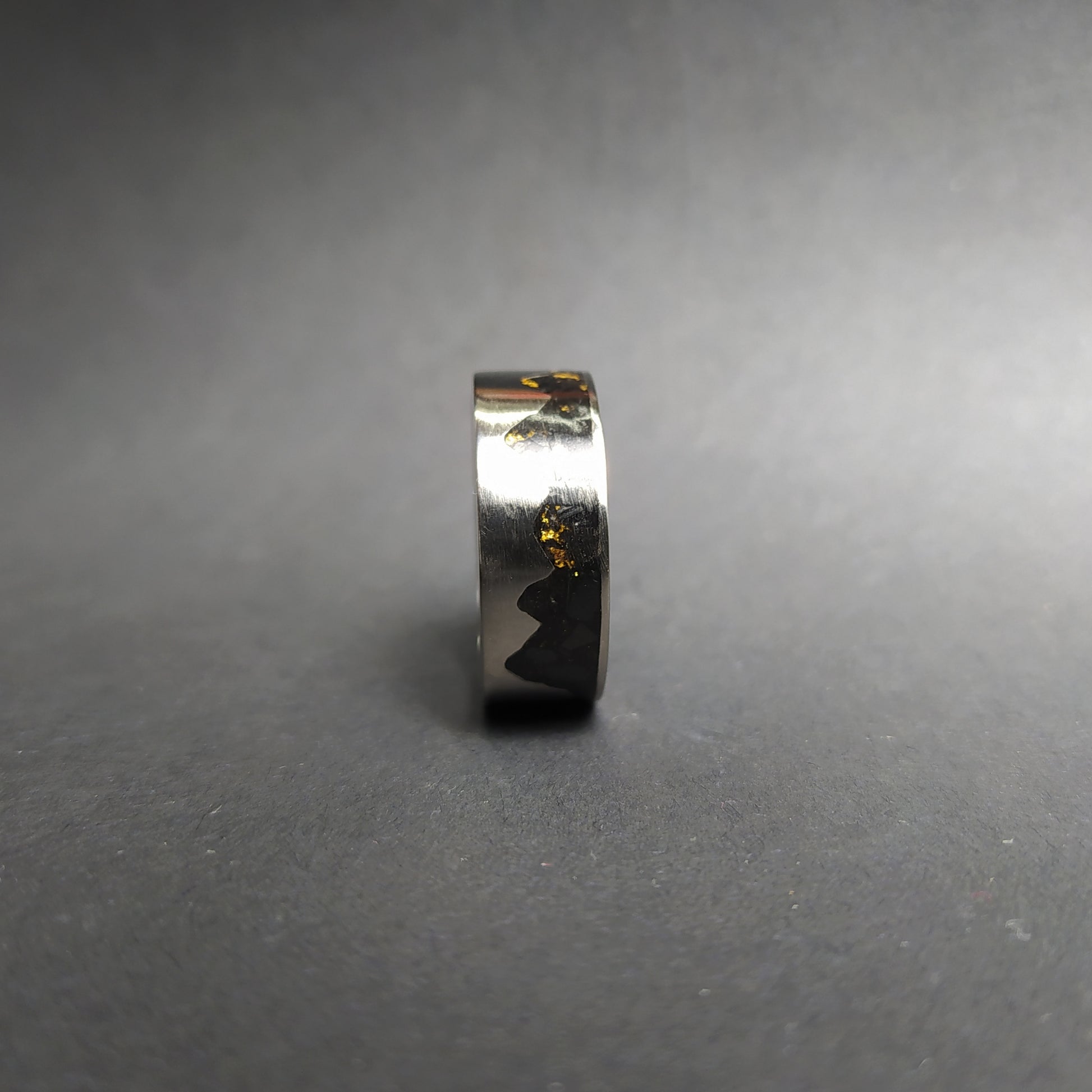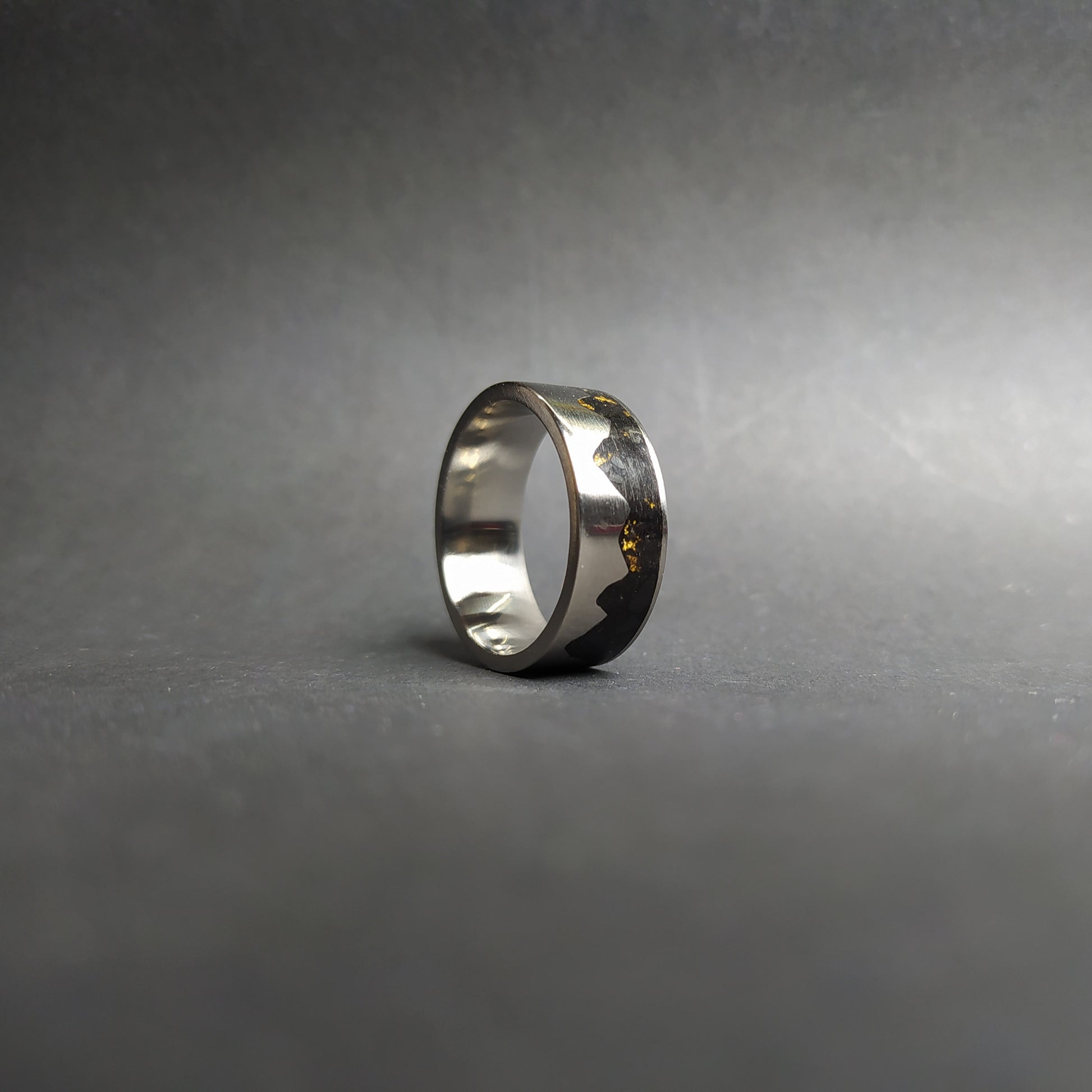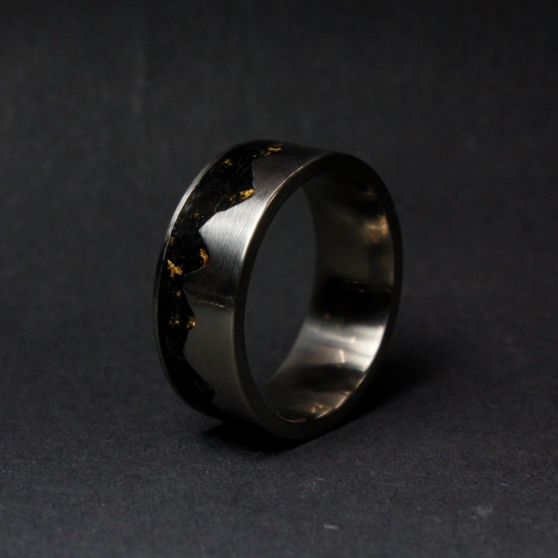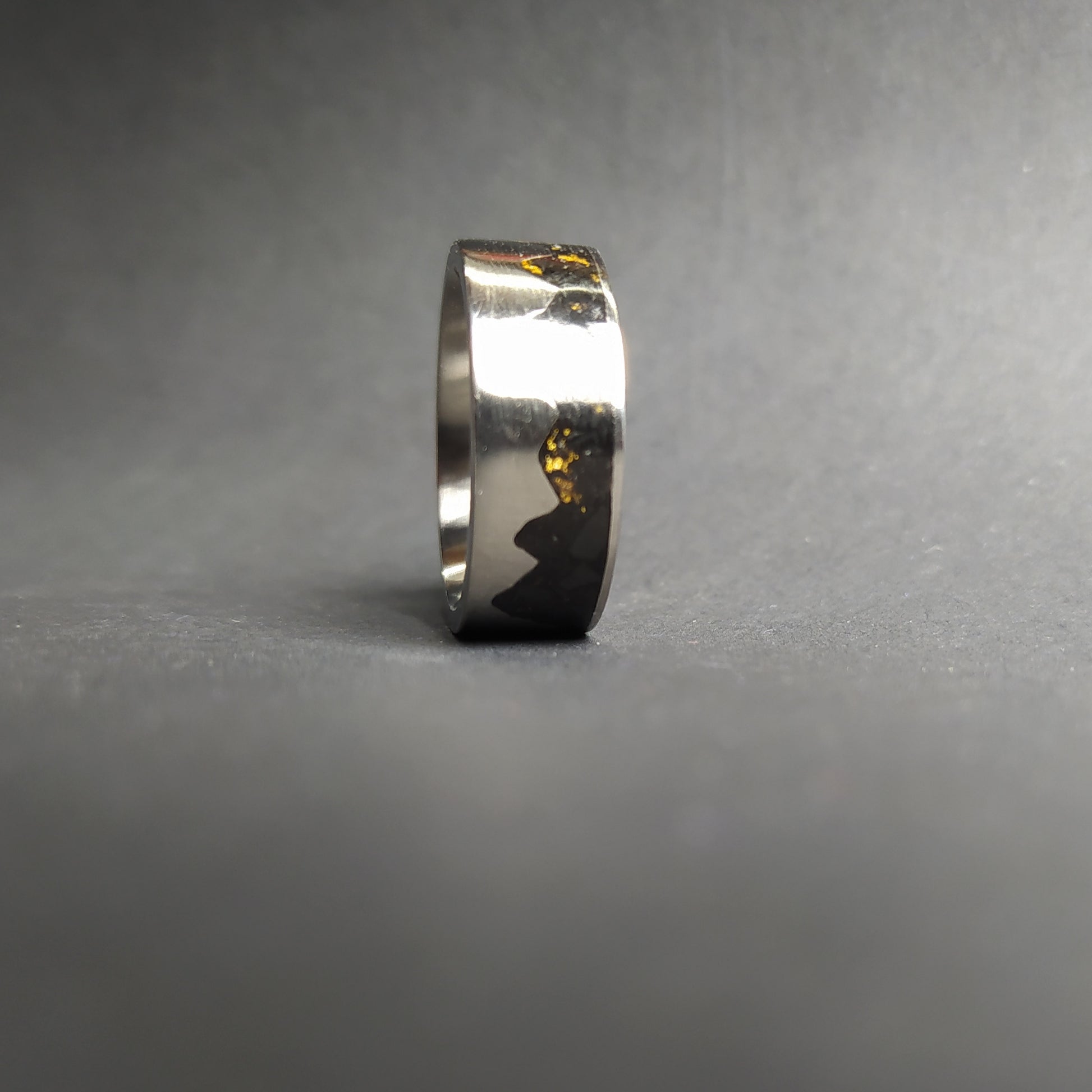 This listing is for the unique gold mountain ring made out of titanium ring inlaid with black crushed stone and gold leaves.
