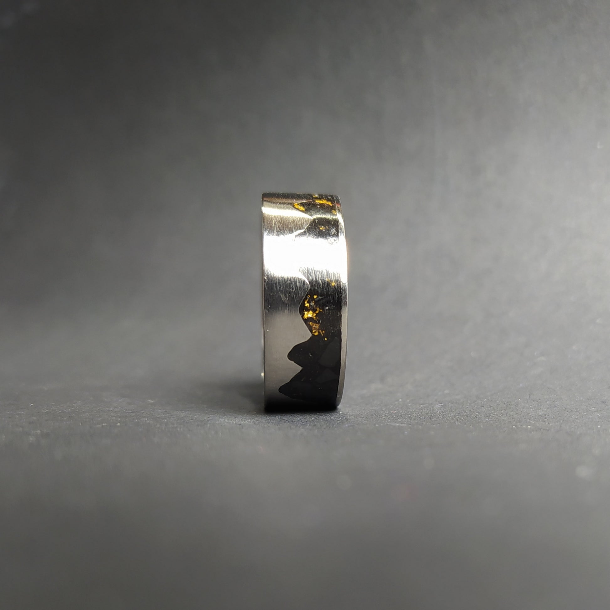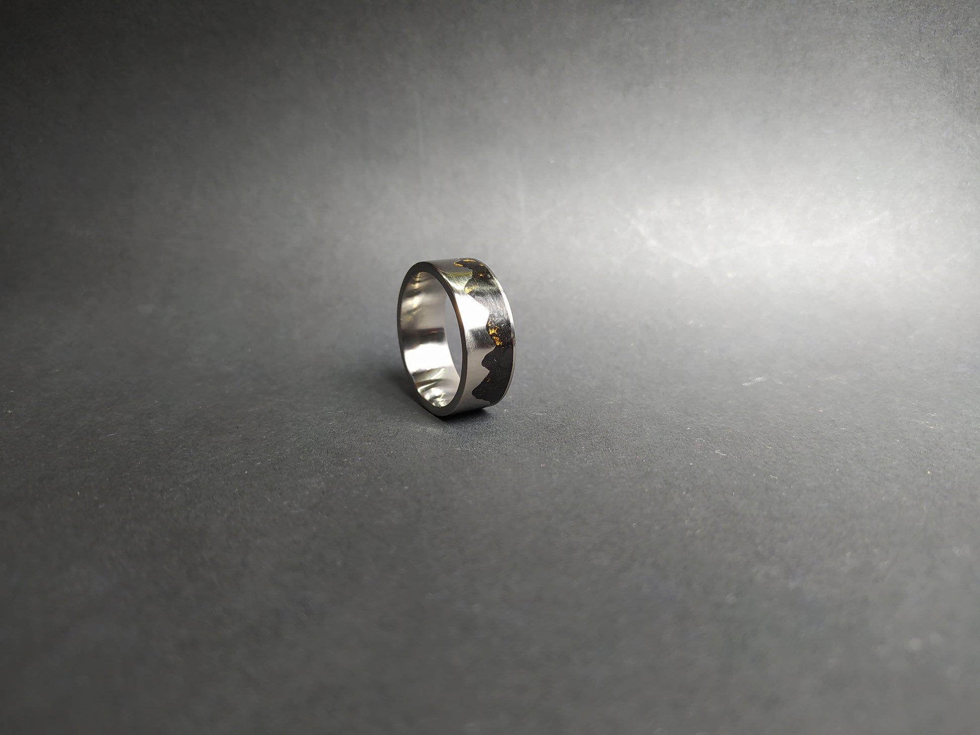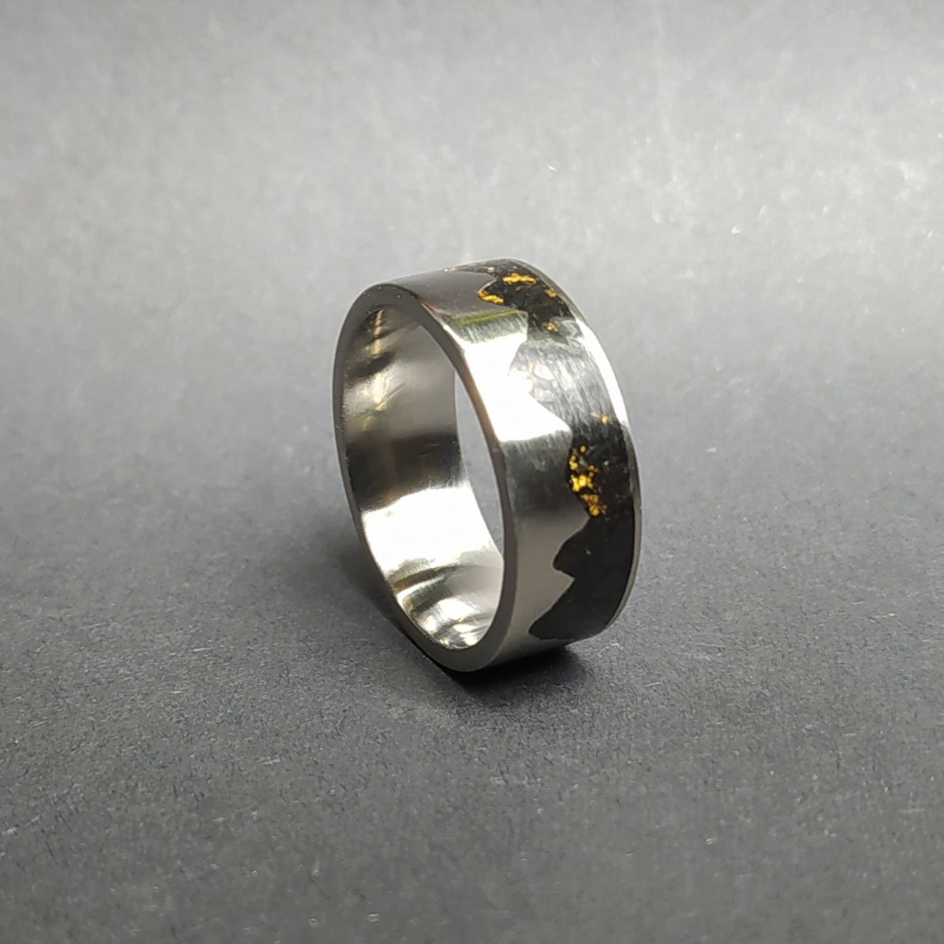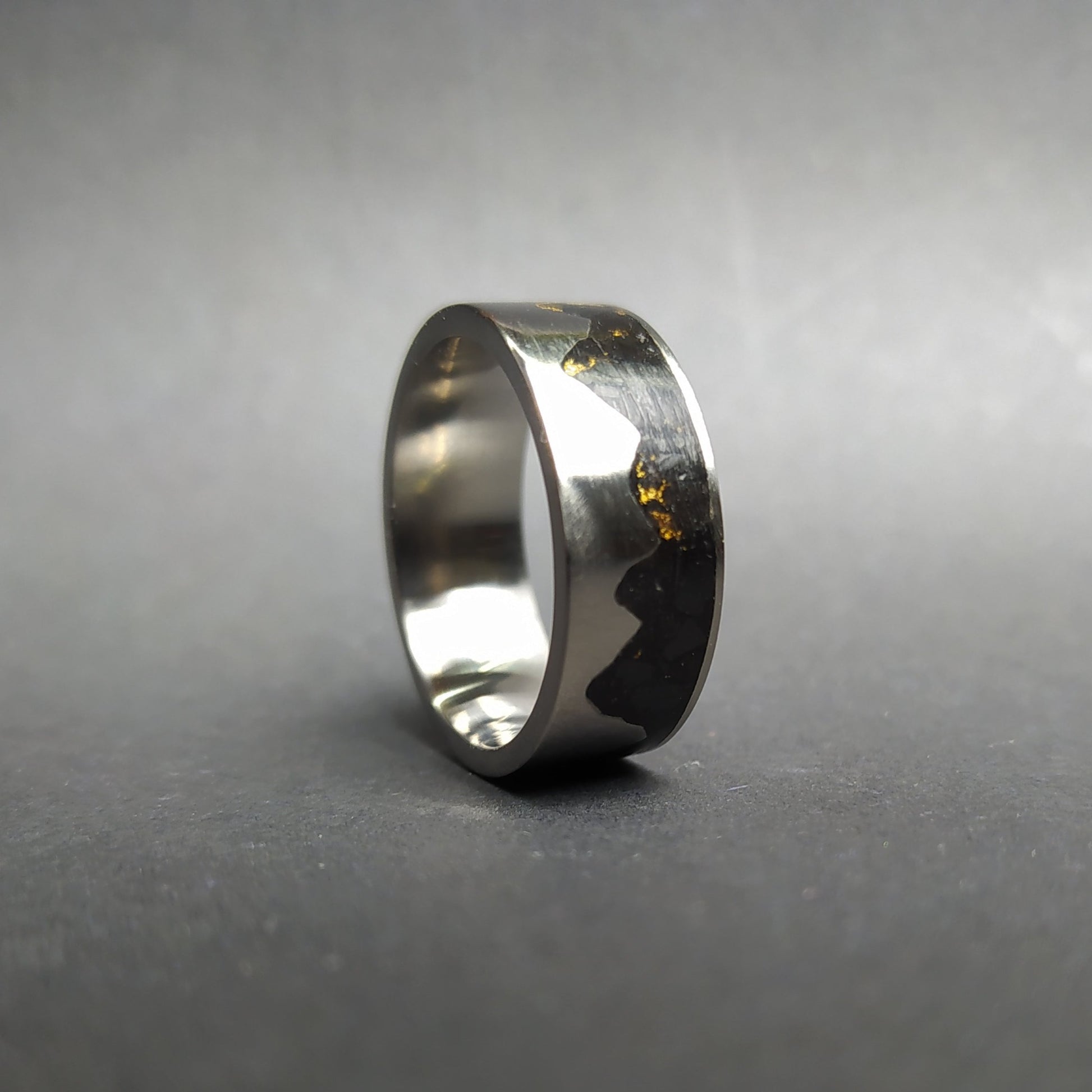 This listing is for the unique gold mountain ring made out of titanium ring inlaid with black crushed stone and gold leaves.