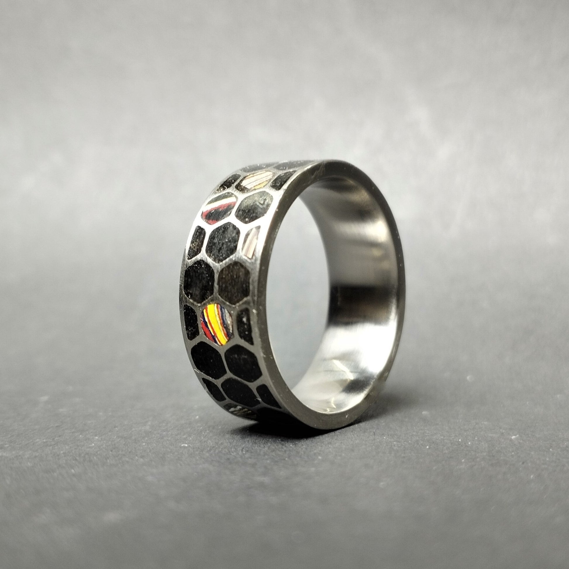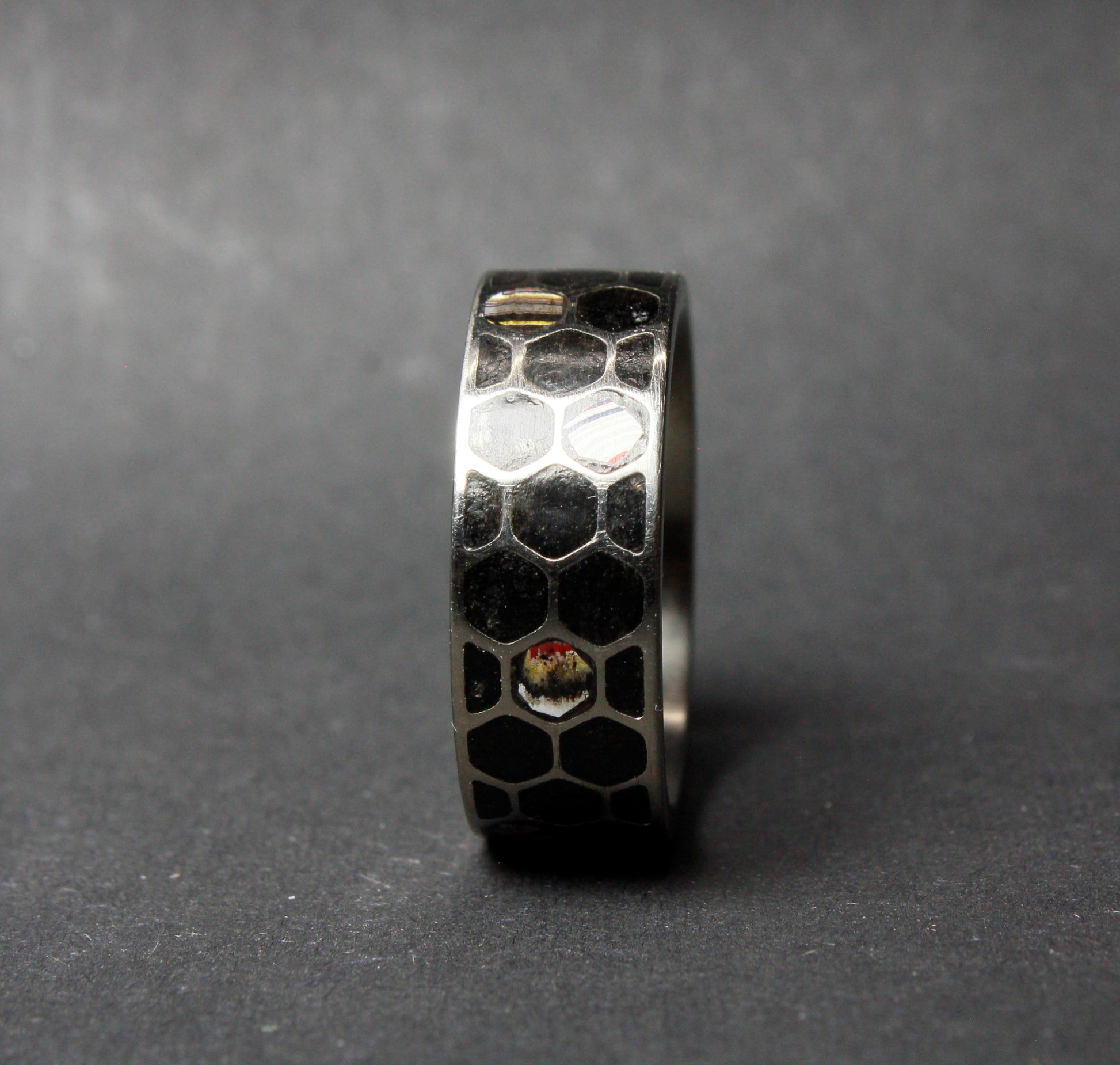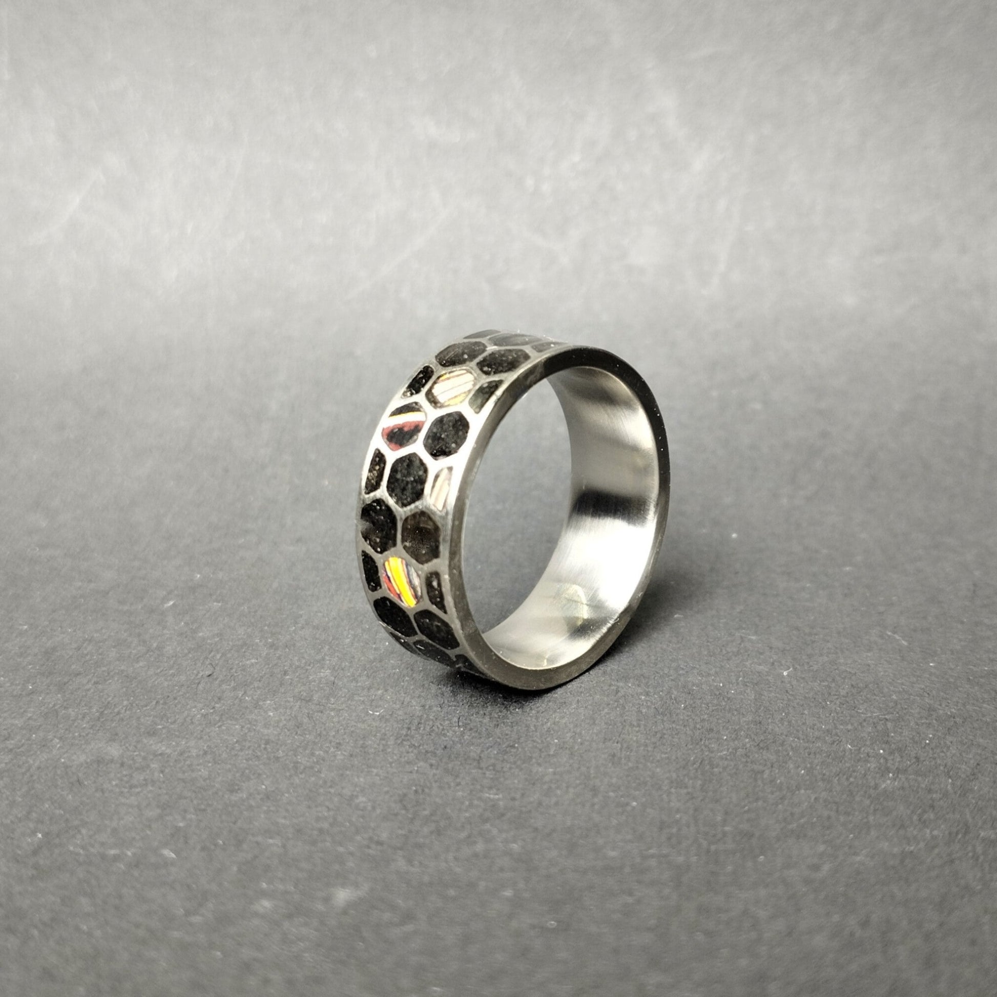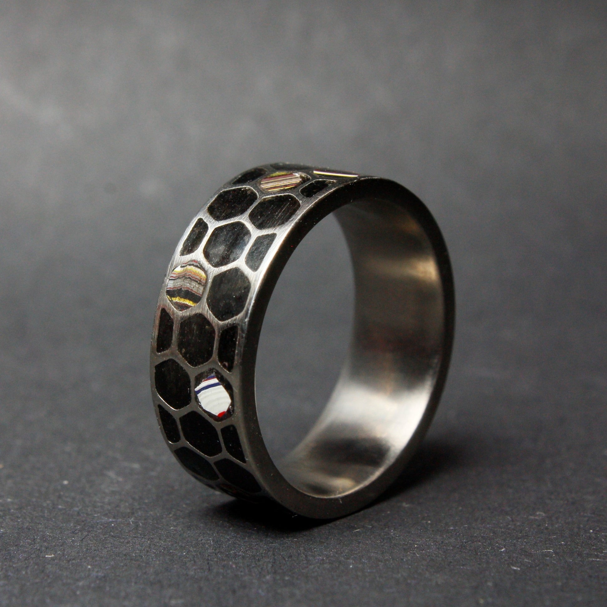 This listing is for a unique ring made out of titanium ring inlaid with crushed black stone and corvette fordite.