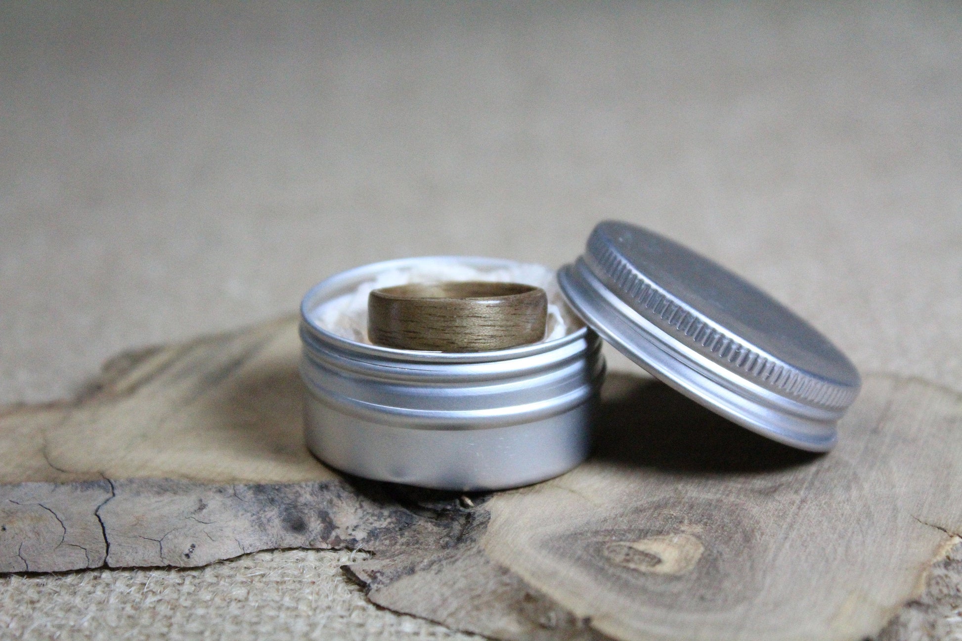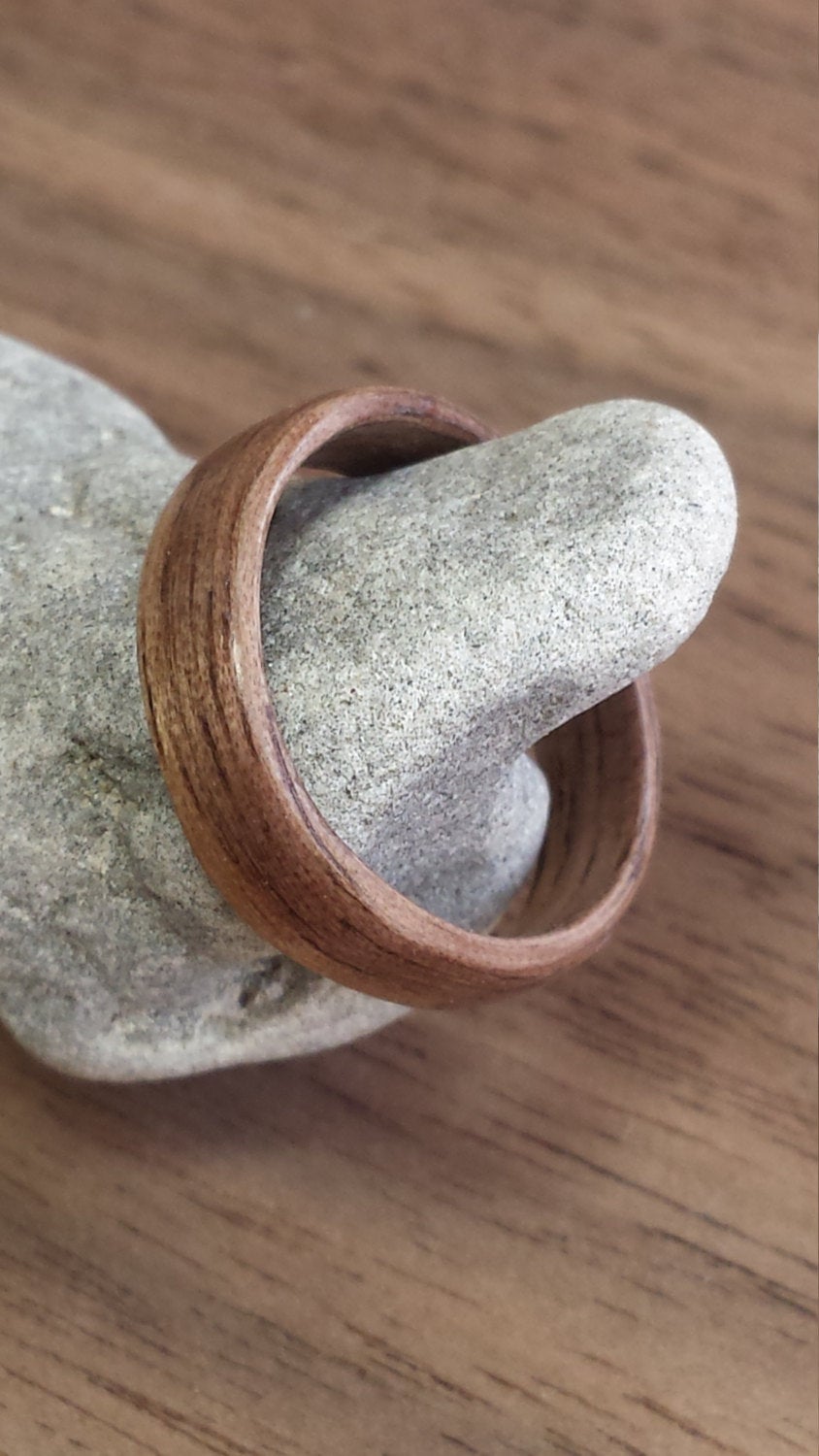 Your ring will be crafted in the bentwood method. In this process, the wood (veneer) is first steamed and bent so it can form a ring. After the veneer is dry it is carefully rolled with the grain direction creating a ring built out of several thin layers. This process gives the rings a very high strength and shows the natural grain of the wood. The ring is finally sanded to size and width, coated with several waterproof layers and polished by hand to the desired finish.